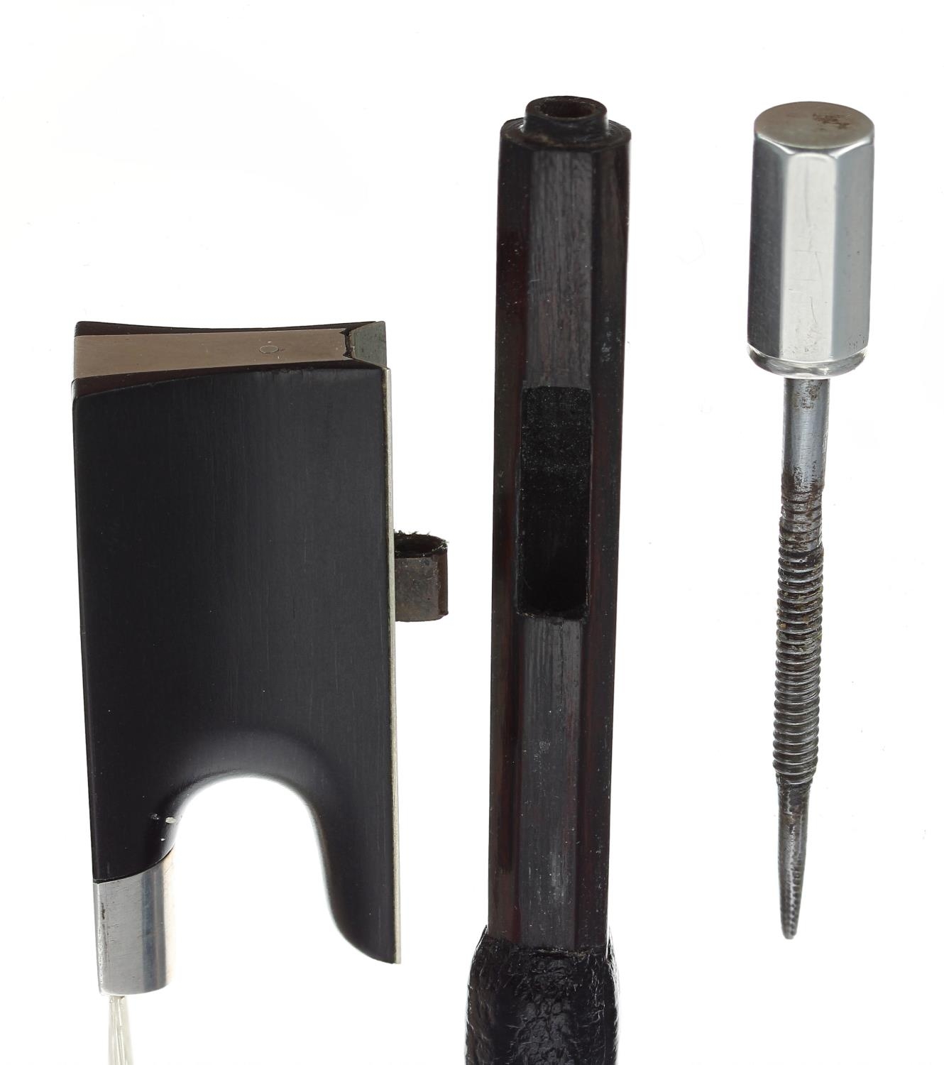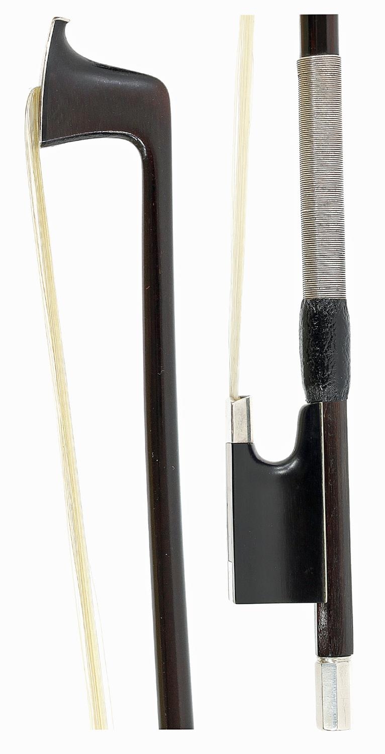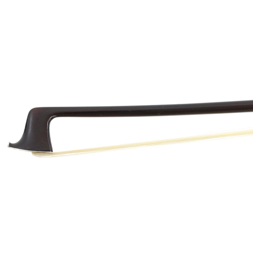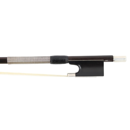 English silver mounted violin bow by and faintly stamped J. Tubbs, the stick round, the ebony frog plain and with a silver overlaid ebony adjuster, 60gm