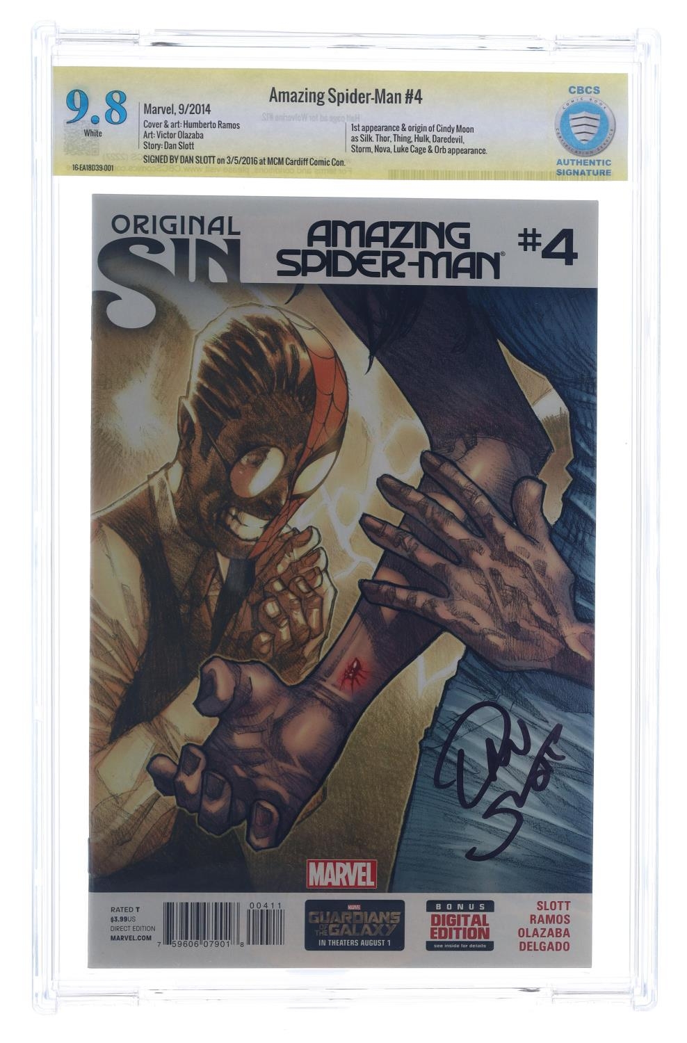 Marvel Comics, Original Sin Amazing Spider-Man issue #4, circa 2014, CBCS graded 9.8, white pages, signed by Dan Slott on 3/5/2016 at MCM Cardiff comic con, 1st appearances & origin on Cindy Moon as Silk, also Thor, Thing, Hulk, Daredevil, Strom, Nova, Luke Cage & Orb, Cover & art by Humberto Ramos, Art by Victor Olazaba & story by Dan Slott