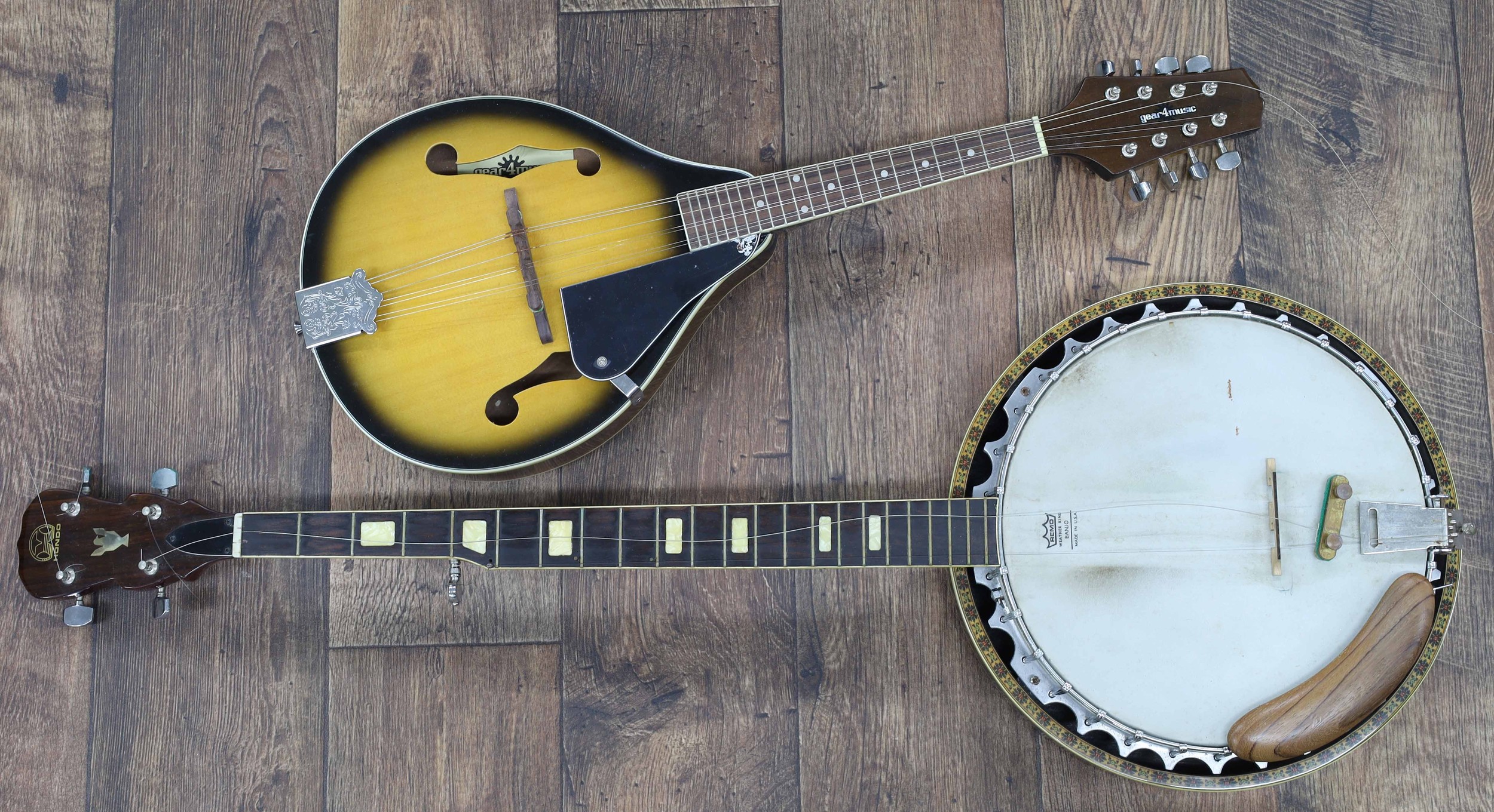 Hondo five string banjo, with American Eagle graphic to the resonator back, hard case; together with a Gear4Music MA01VS model mandolin (2)