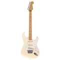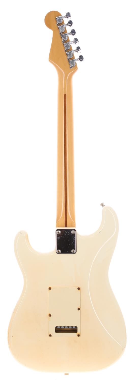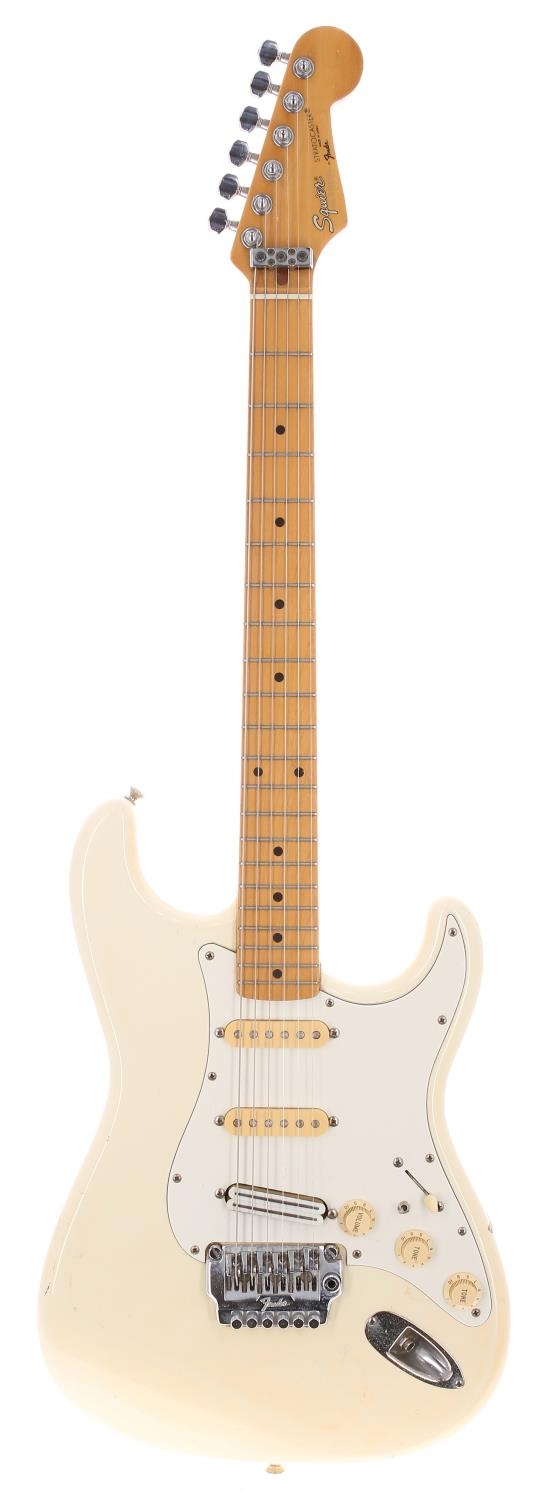 Mid 1980s Squier by Fender Stratocaster electric guitar, made in Japan; Body: Olympic white finish, discolouration, finish cracking and blemishes to treble side, further dings and scratches; Neck: maple; Fretboard: maple; Frets: light wear; Electrics: working, modified with rail bridge pickup and coil switch added; Hardware: good, System One bridge and locking nut; Weight: 3.99kg; Overall condition: fair
