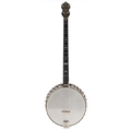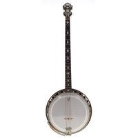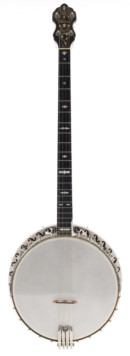 Bacon & Day 'Silver Bell' four string banjo, with mahogany boxwood banded resonator, 11" skin and geometric mother of pearl inlay to the fretboard, the shaped head inlaid with the maker's monogram and inscribed 'Silver Bell', case