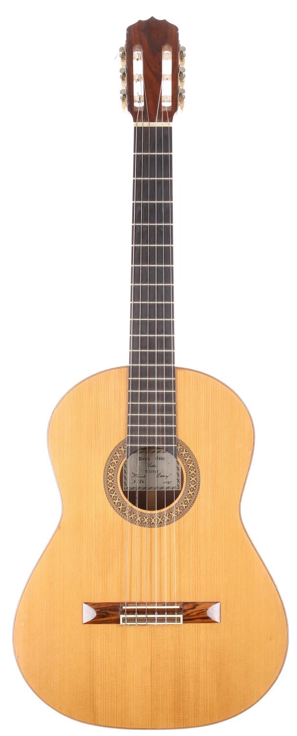 1991 David Oddy classical guitar, made in Exeter, England; Back and sides: walnut, crack opening to bass side of centre to upper bout, further minor dings; Top: natural spruce, light checking and other minor marks; Neck: cedar; Fretboard: ebony; Frets: good; Scale length: 650mm; Nut width: 52mm; Overall condition: fair