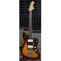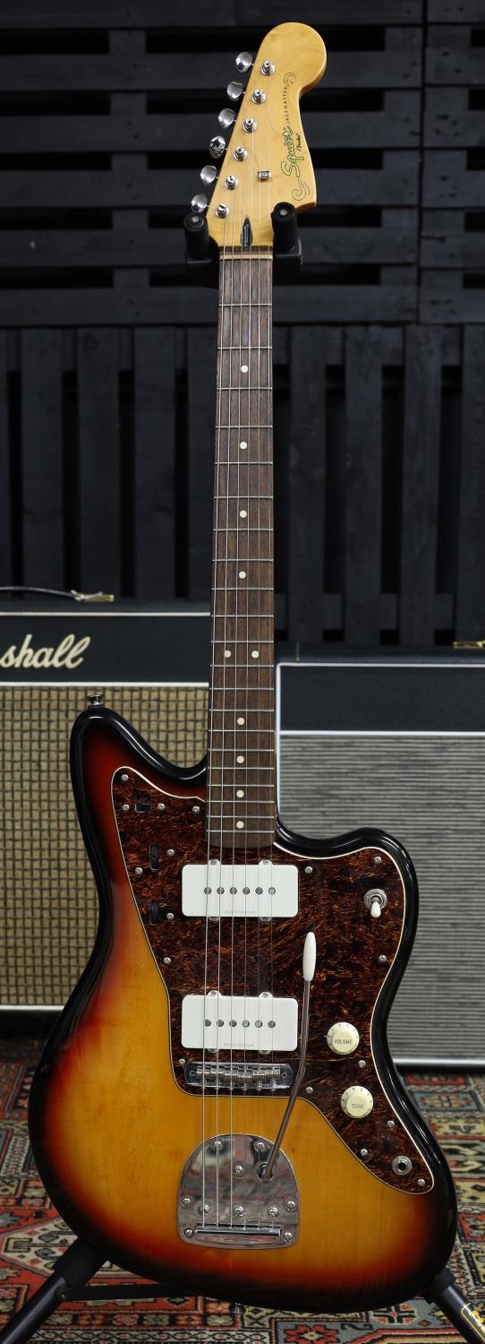 2013 Squier by Fender Jazzmaster electric guitar, made in Indonesia; Body: three-tone sunburst finish; Neck: maple; Fretboard: rosewood; Frets: good; Electrics: working; Hardware: good; Case: soft bag; Overall condition: very good