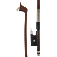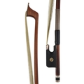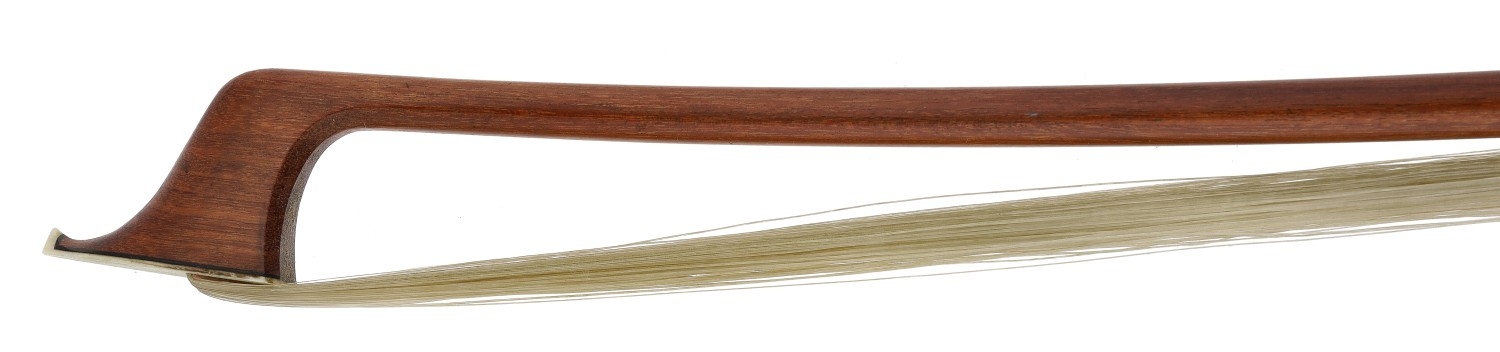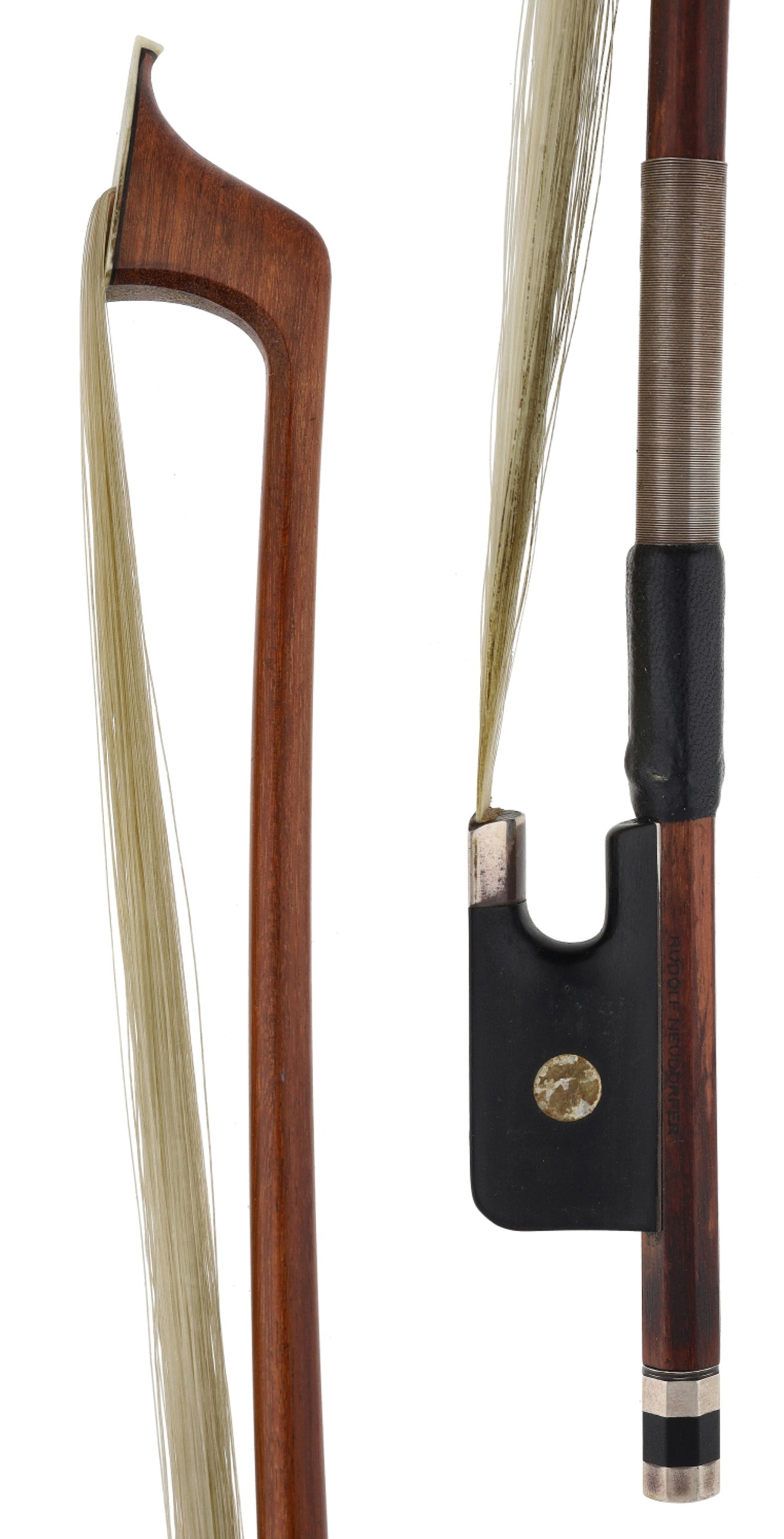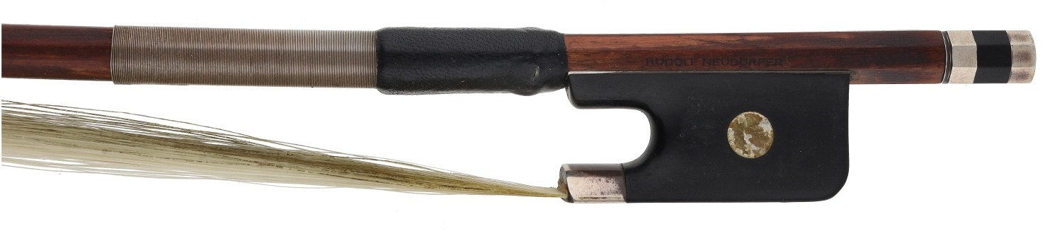 PRIVATE COLLECTION - German silver mounted violoncello bow by and stamped Rudolf Neudorfer, the stick round, the ebony frog inlaid with pearl eyes and the ebony adjuster with two silver bands, 81gm
