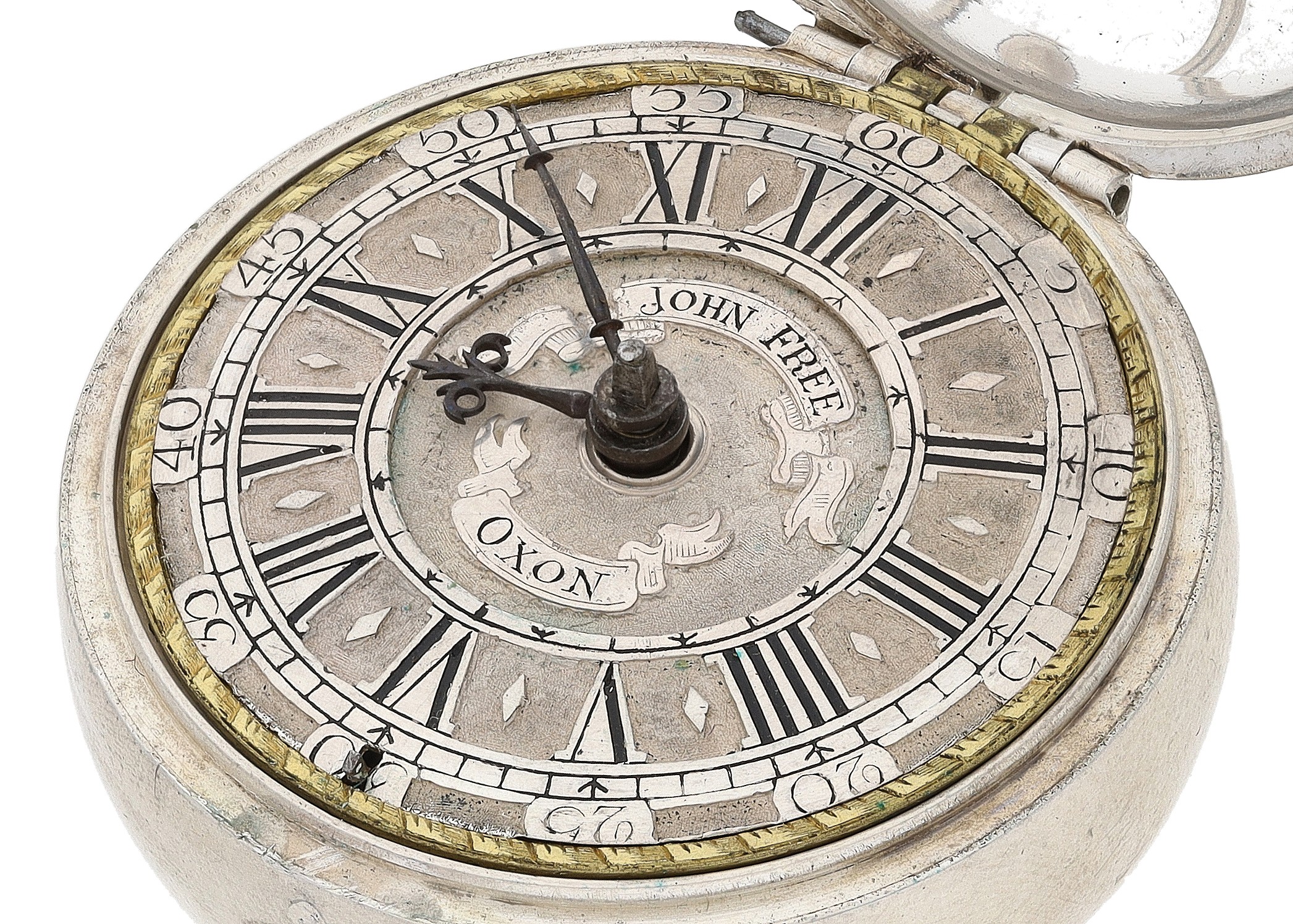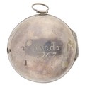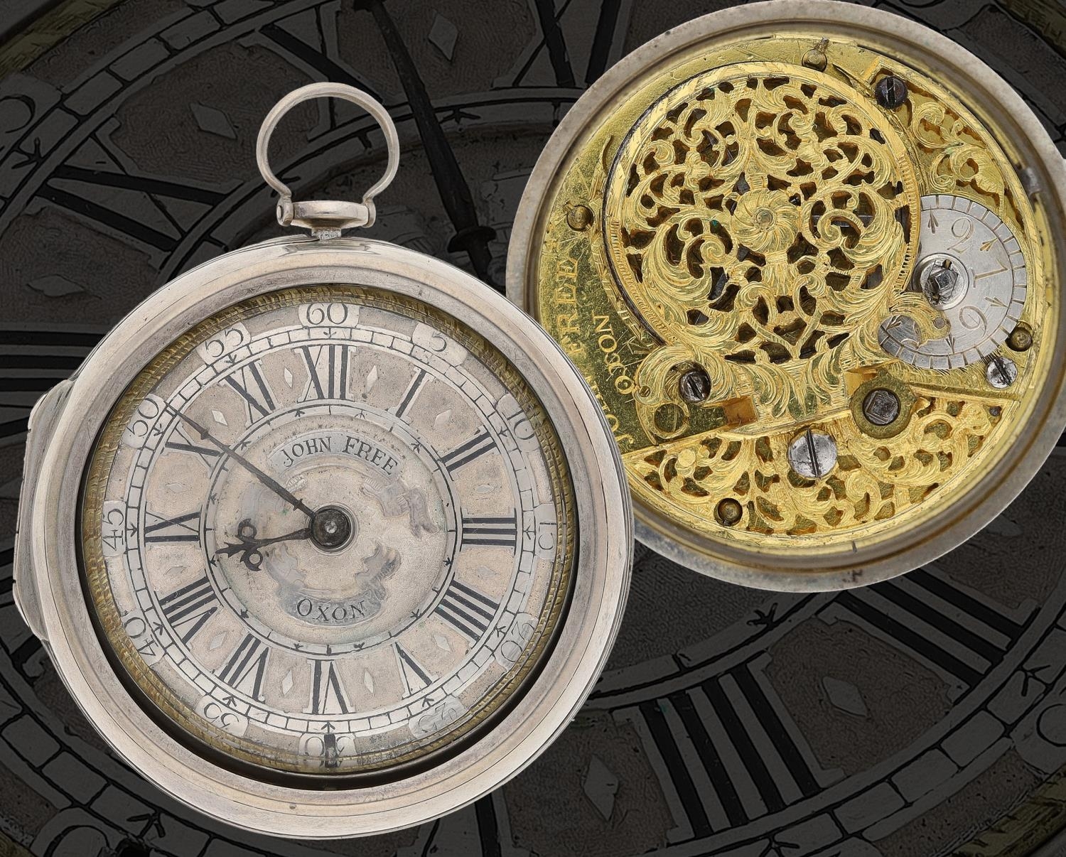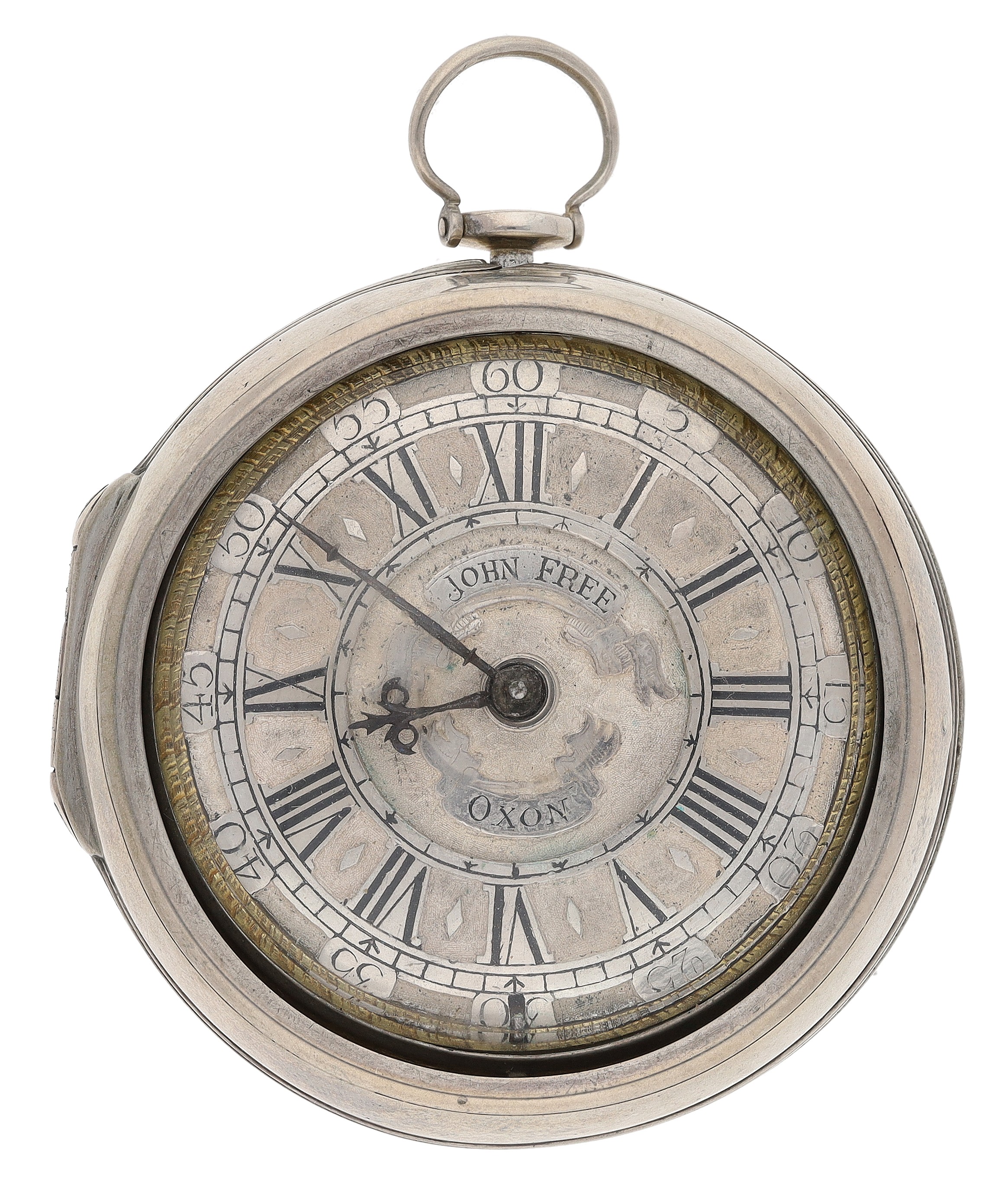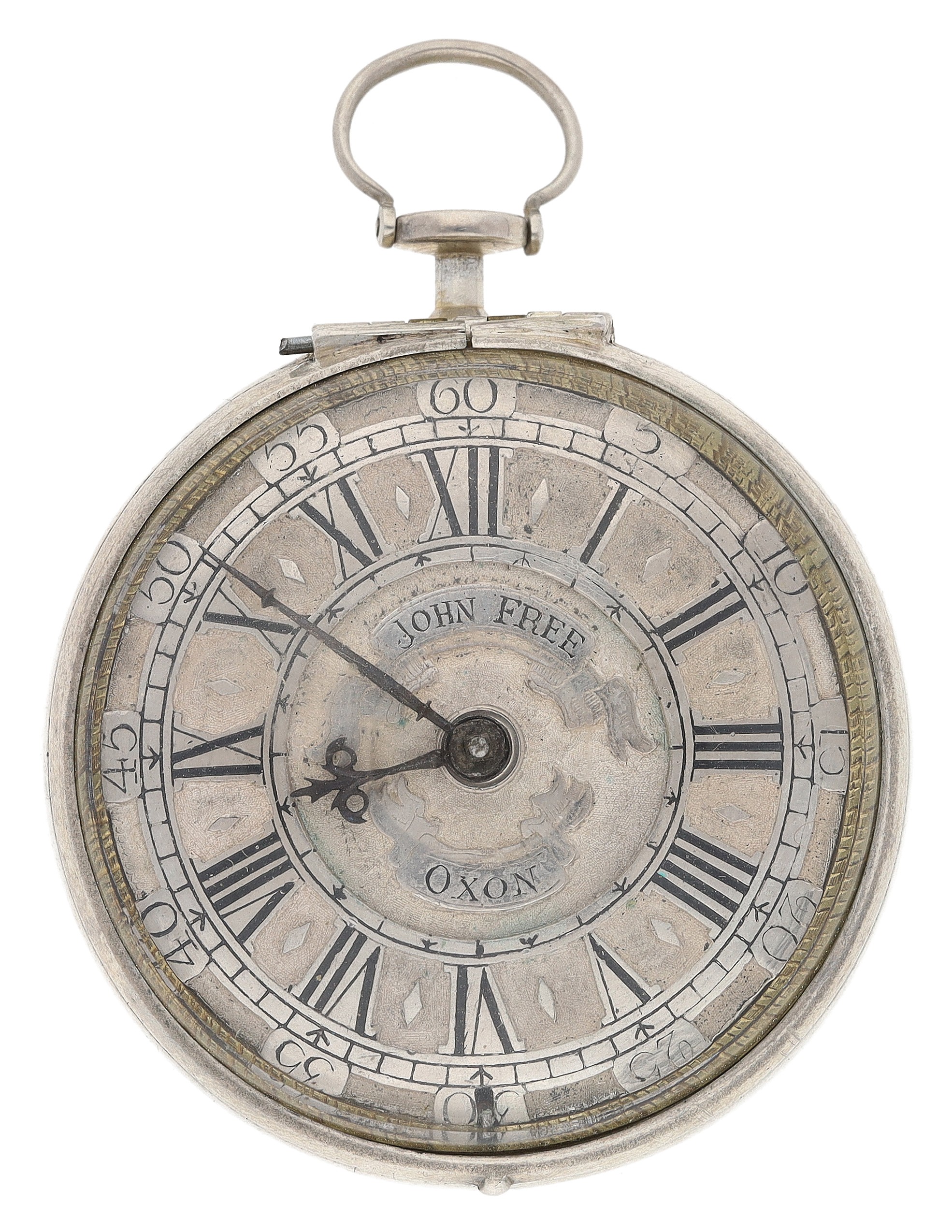 John Free, Oxon - fine early 18th century silver pair cased verge pocket watch, No. 47, signed fusee movement with flat steel balance, pierced and engraved winged balance cock and foot, silver regulating dial and Egyptian pillars, signed champlevé dial with Roman numerals and Arabic minute numerals, beetle and poker hands, bulls eye glass, plain cases with the outer case engraved 'T. Hardy 1767', case maker I.W', 56mm