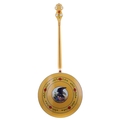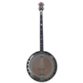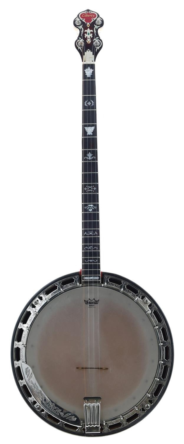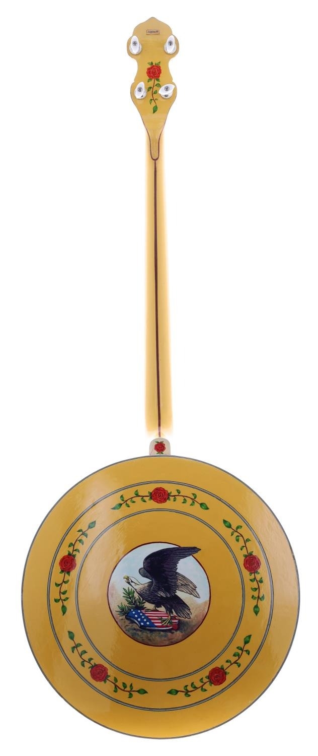 Liberty 'Vox' style plectrum four string banjo, decorated to the resonator back with an eagle with outstretched wings standing on an American shield within foliate banded borders, with stylised engraved metalwork, stylised mother of pearl inlay to the fretboard and jewelled shaped head, 11" resonator and 26.25" scale length, hard case