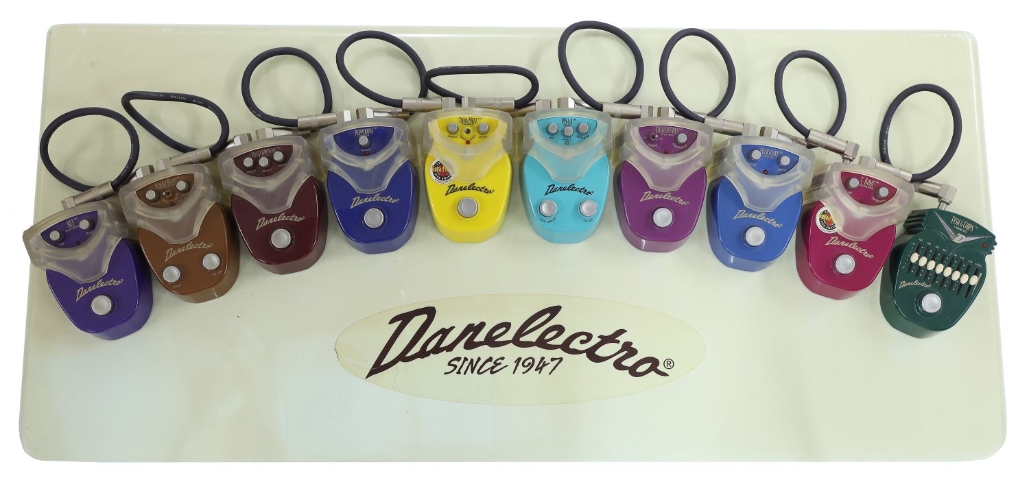 Danelectro Mini pedal display board, fitted with the full range of Mini Series pedals including BLT, Rocky Road, Hash Browns, Pepperoni, Tuna Melt, PB&J, French Fries, Milkshake, T-Bone and Fish & Chips, including power supply and cables