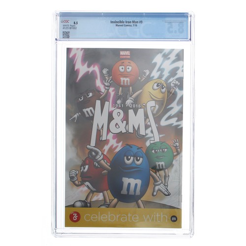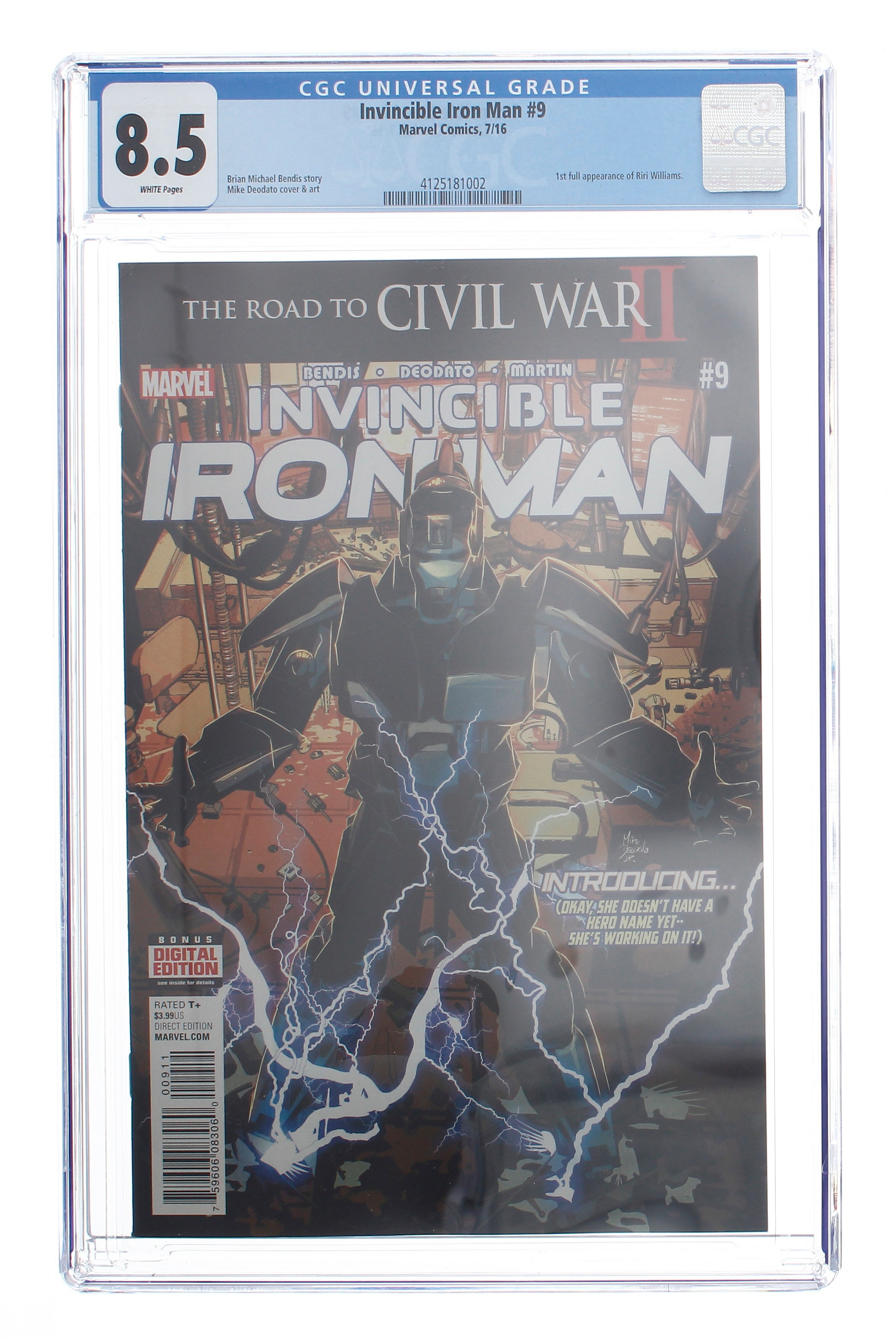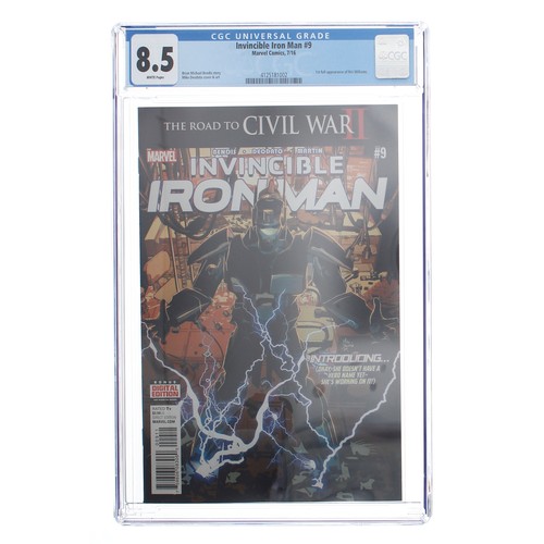Marvel Comics, Invincible Iron-Man issue #9, 1st full appearance of Riri Williams (Iron heart), circa 2016, CGC graded 8.5, white pages, Brian Michael Bendis story, artwork by Mike Deodato
