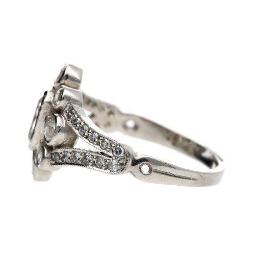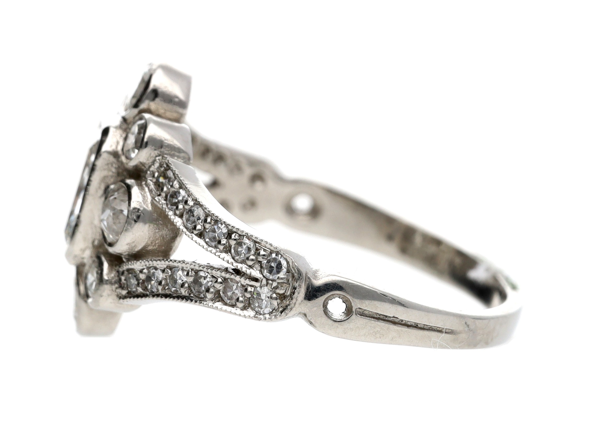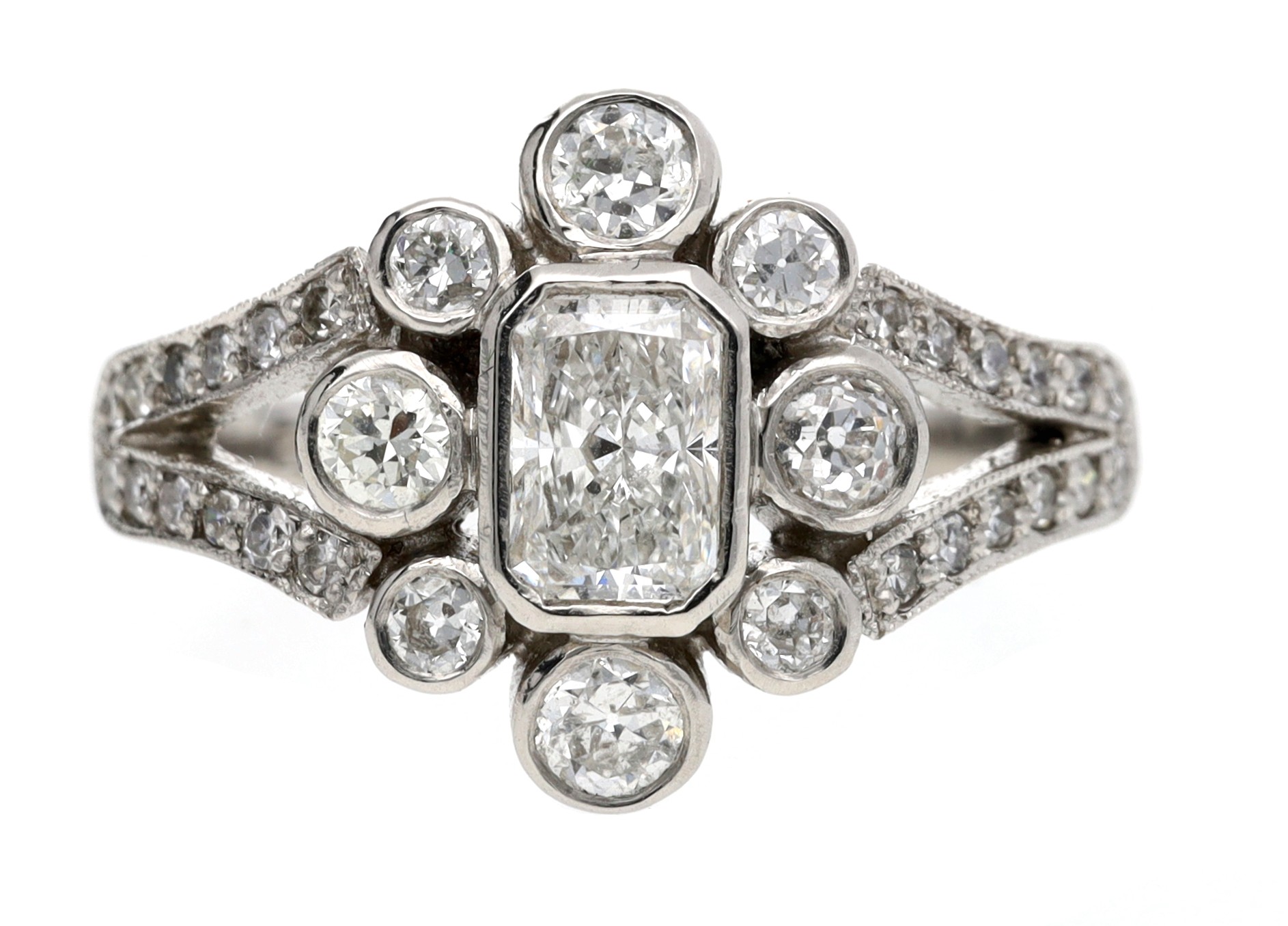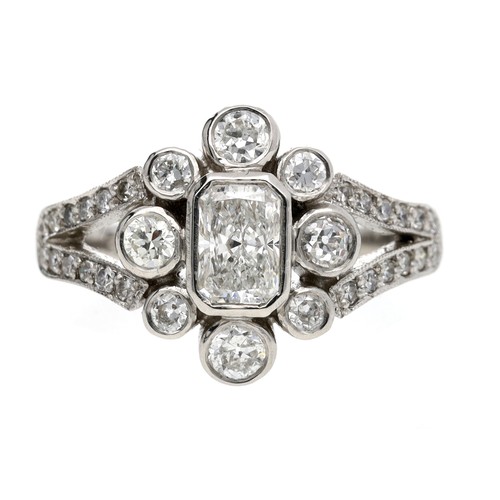 Good platinum diamond dress ring in the Edwardian style, radiant-cut centre diamond 0.55ct approx, width 13.5mm, 5.5gm, ring size L/M