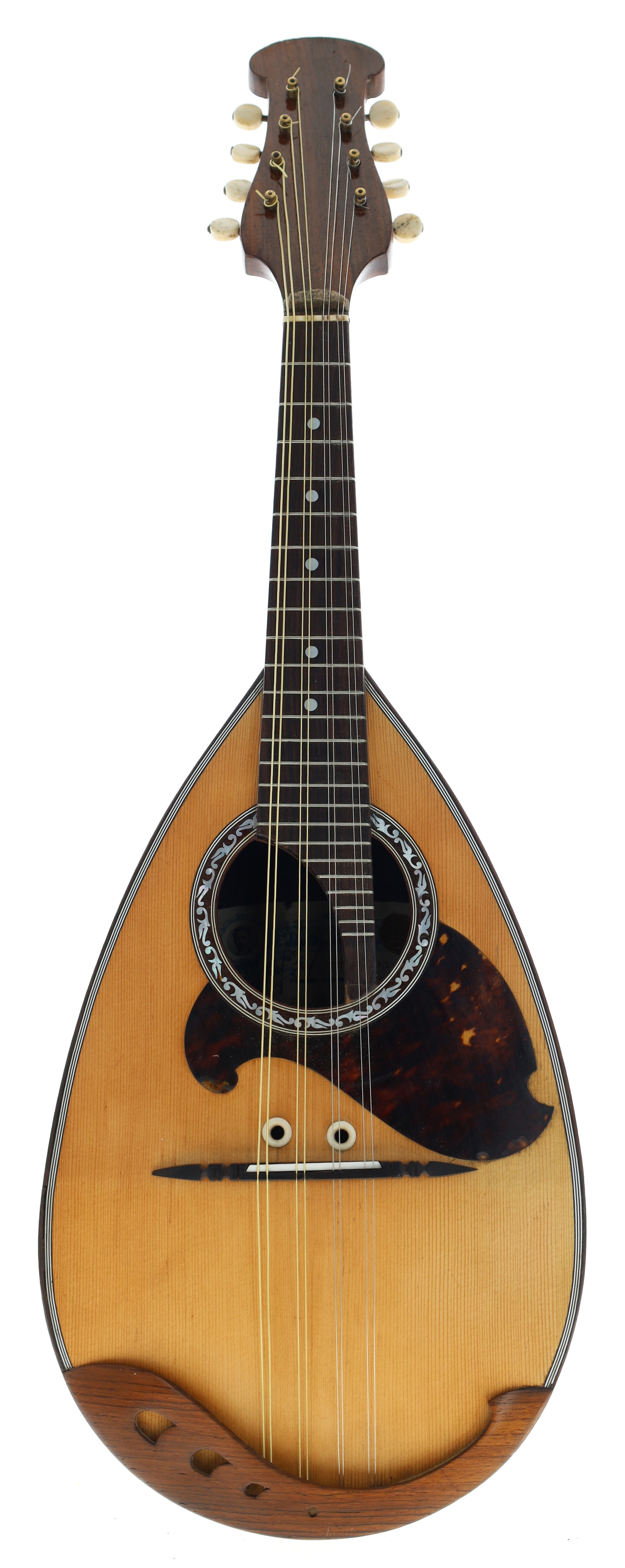 Good Neapolitan mandolin labelled Raffaele Calace & Figlio, Napoli, Anno 1916, and signed on the label, with segmented rosewood bowl back, spruce table and mother of pearl dot markers to the fretboard