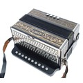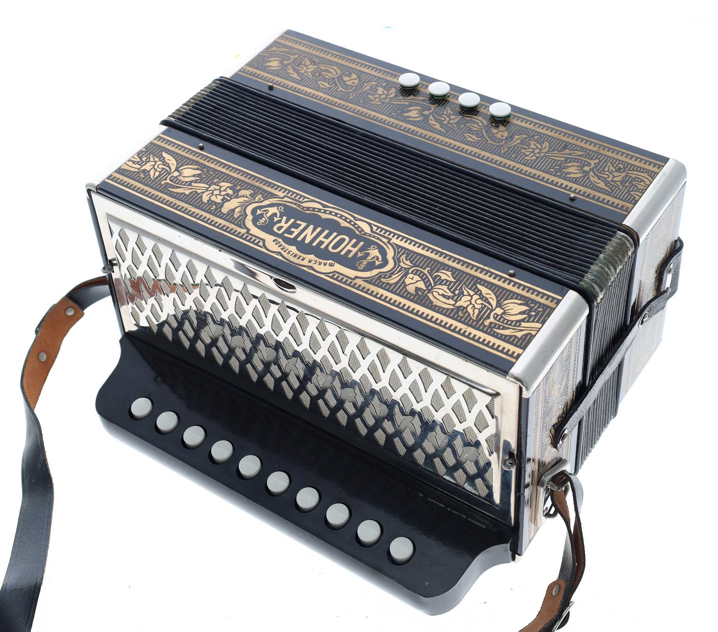 Hohner ten button melodeon, with floral gilt decoration, box
