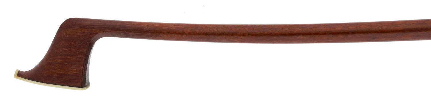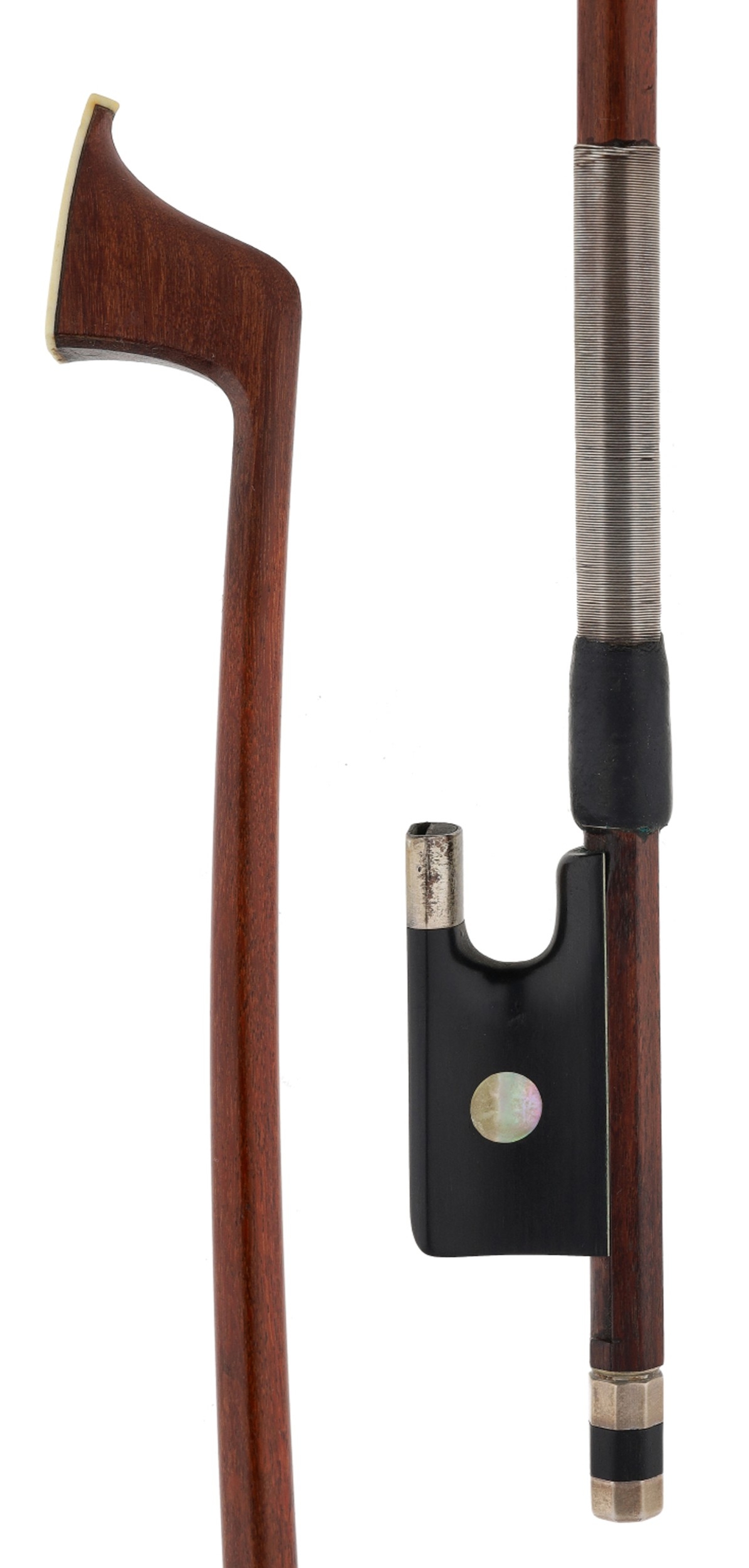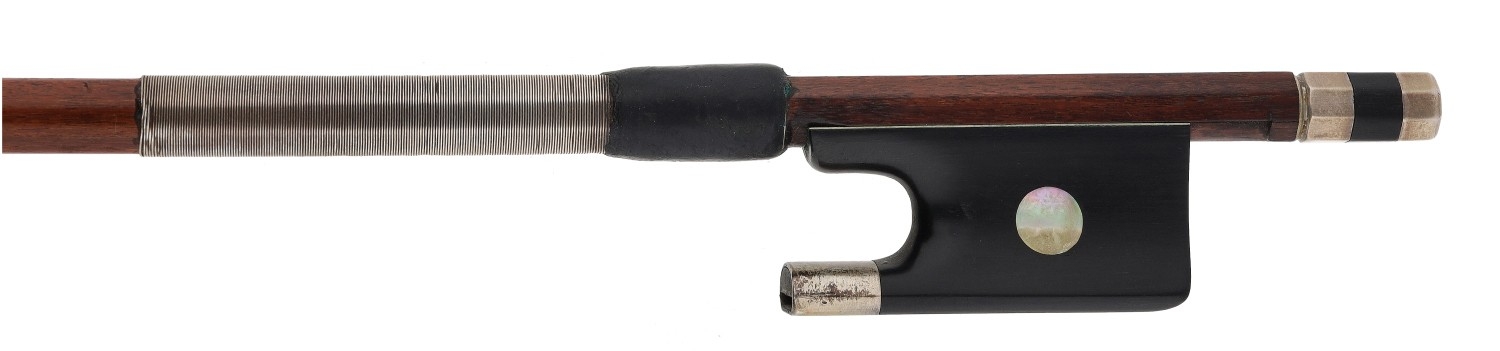 PRIVATE COLLECTION - Nickel-silver Vuillaume Model violoncello bow, the stick round, the ebony frog inlaid with large pearl eyes and the ebony adjuster with two nickel-silver bands, 72gm (without hair)