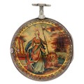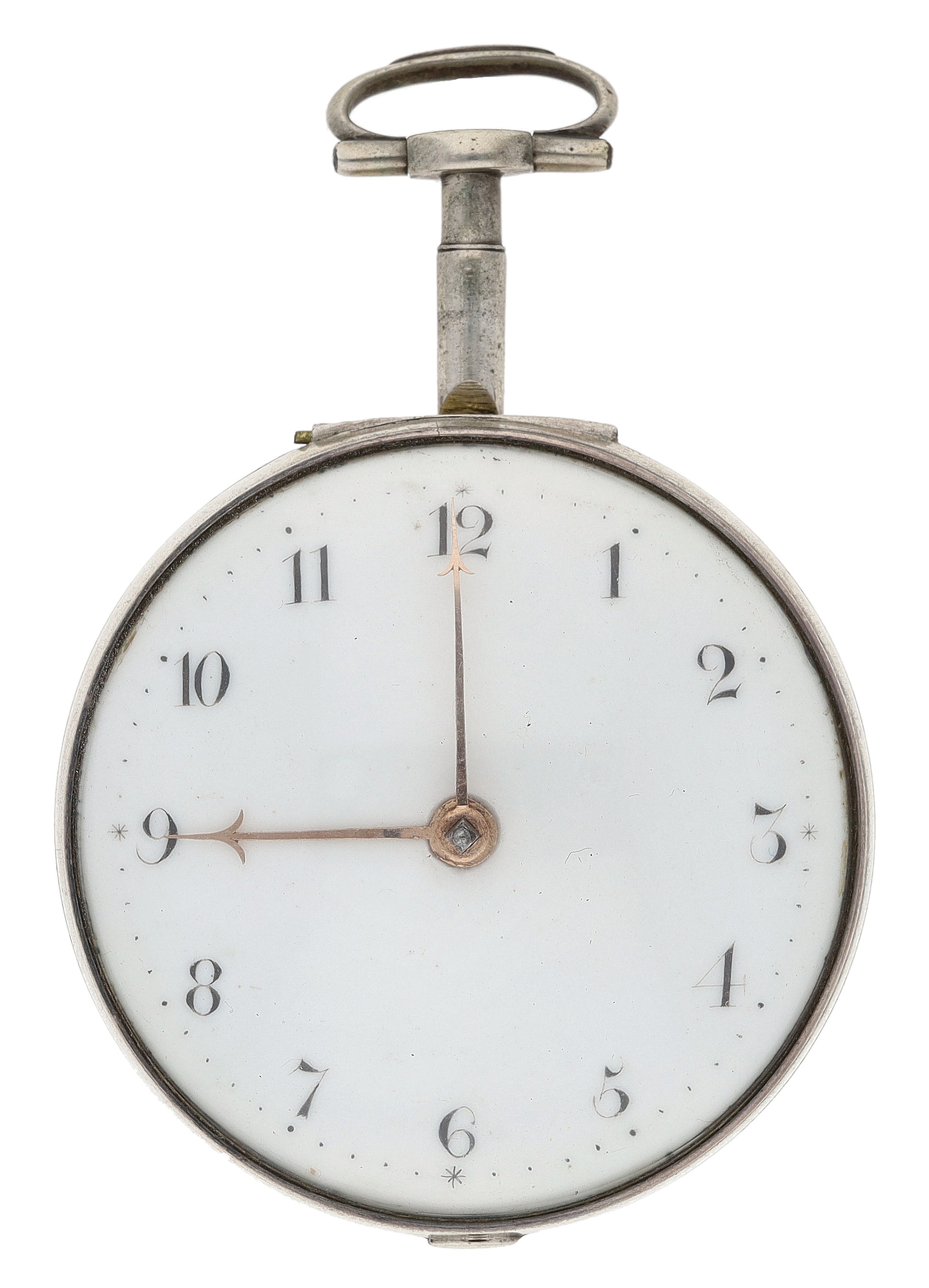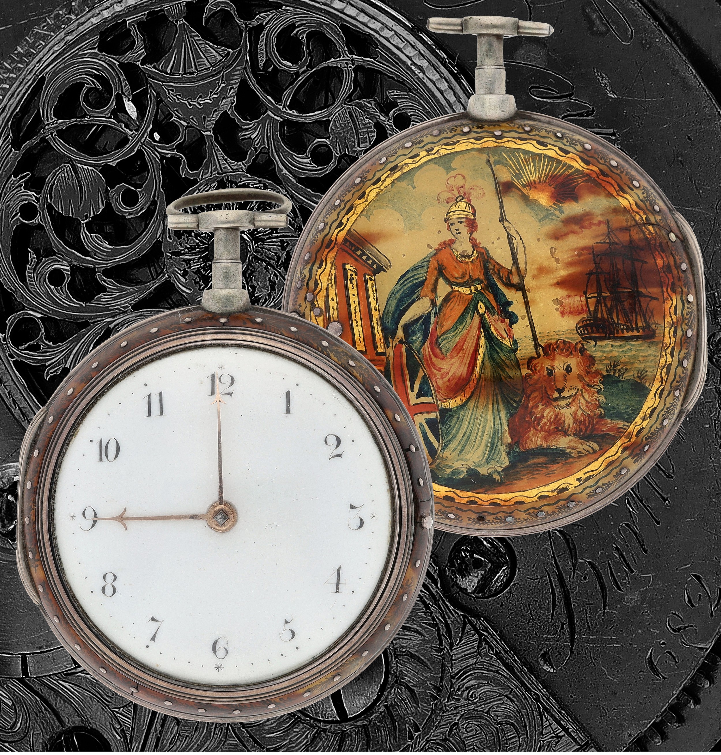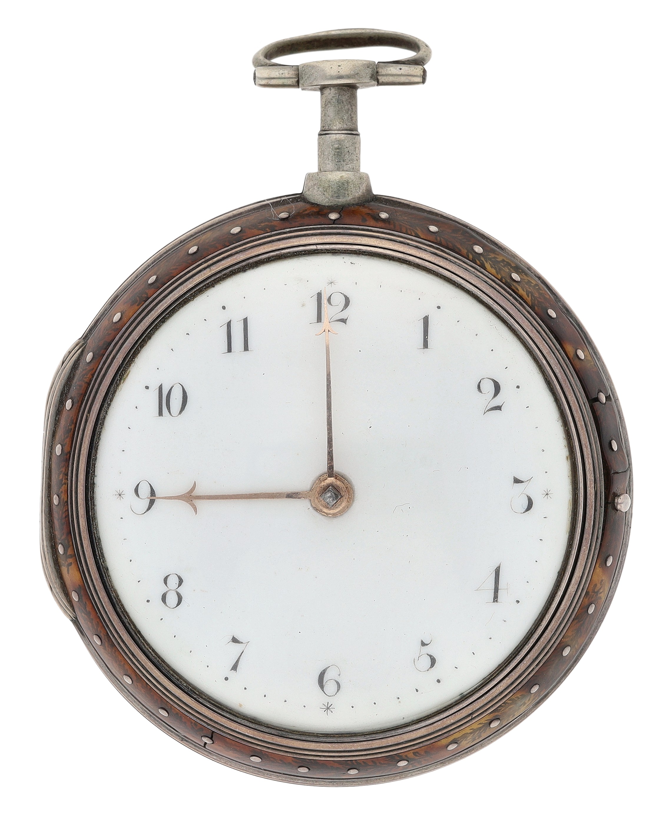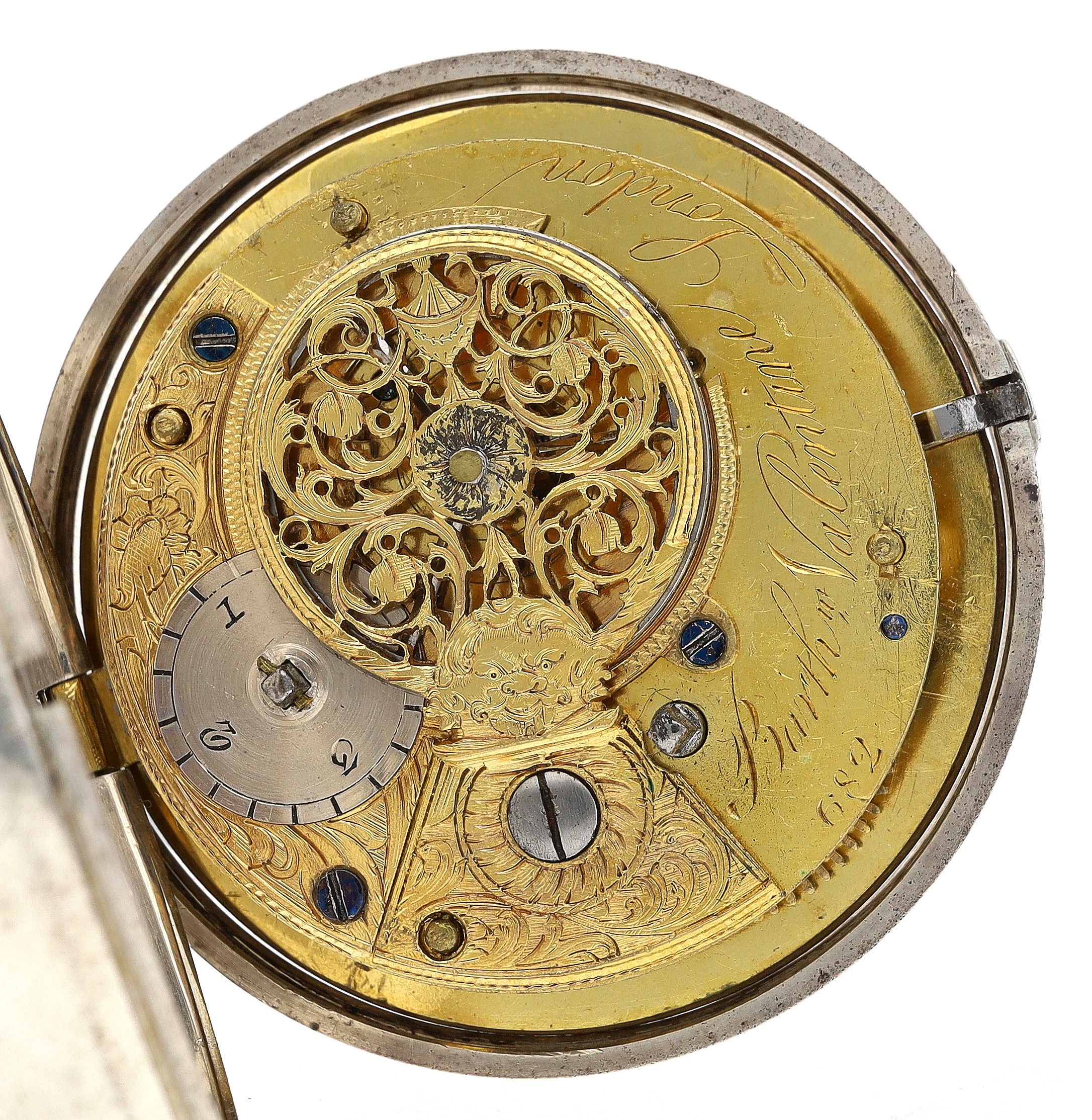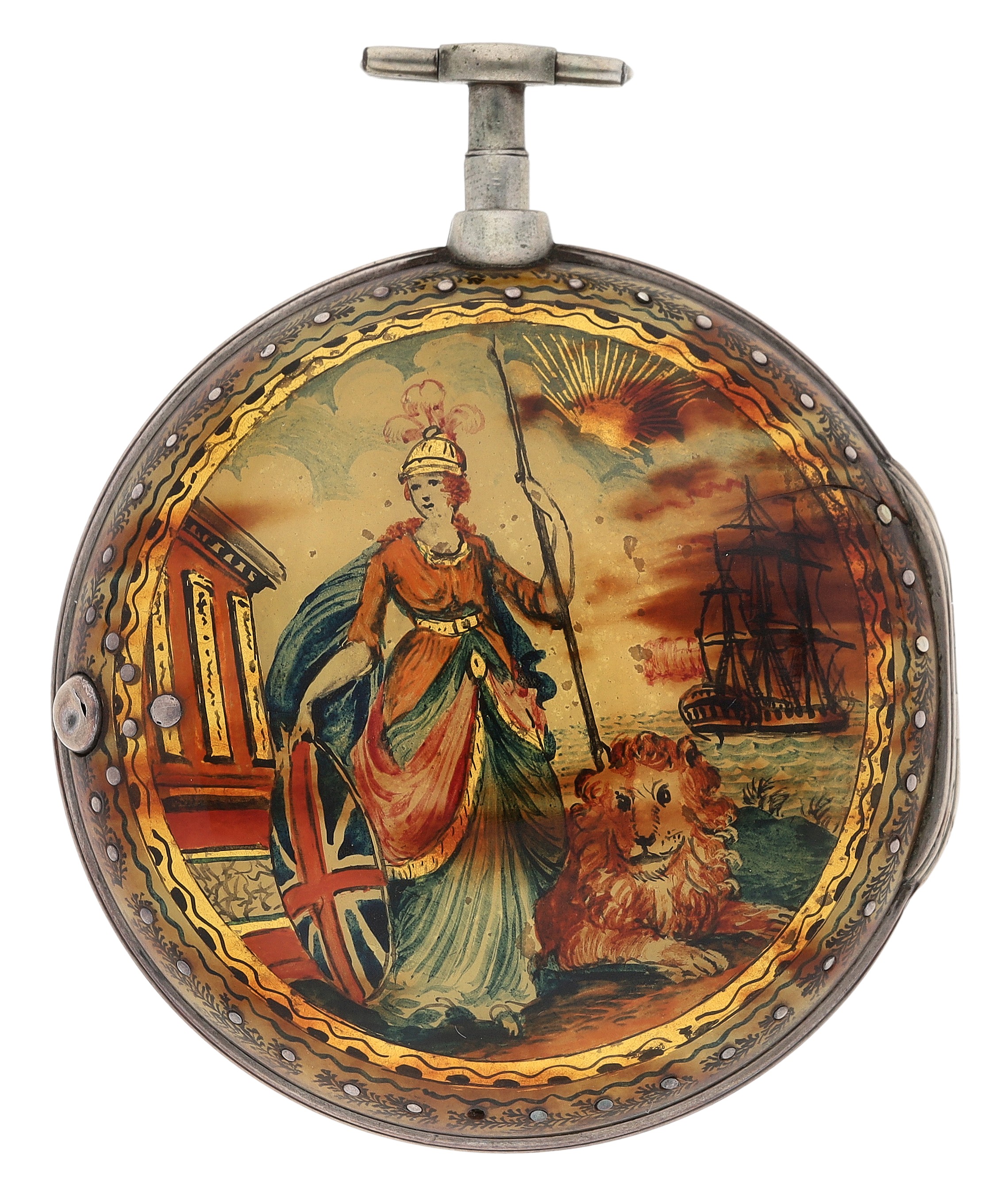 Barth Valentine, London - George III silver and horn 'Britannia' pair cased verge pocket watch, London 1801, No. 682, signed fusee movement, flat steel balance, foliate pierced and engraved balance cock, silvered regulating dial and cylindrical pillars, enamel dial with Arabic numerals and gold hands, the outer case horn case with pinwork decoration display an image of Britannia, inner case maker 'TC' (Thomas Carpenter), 55mm