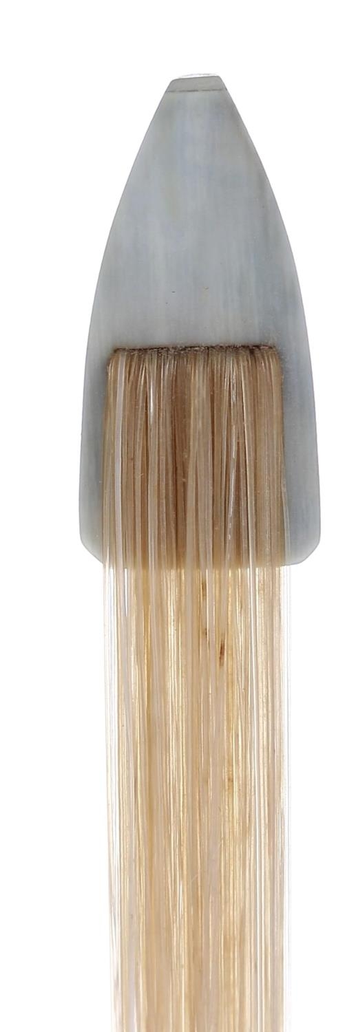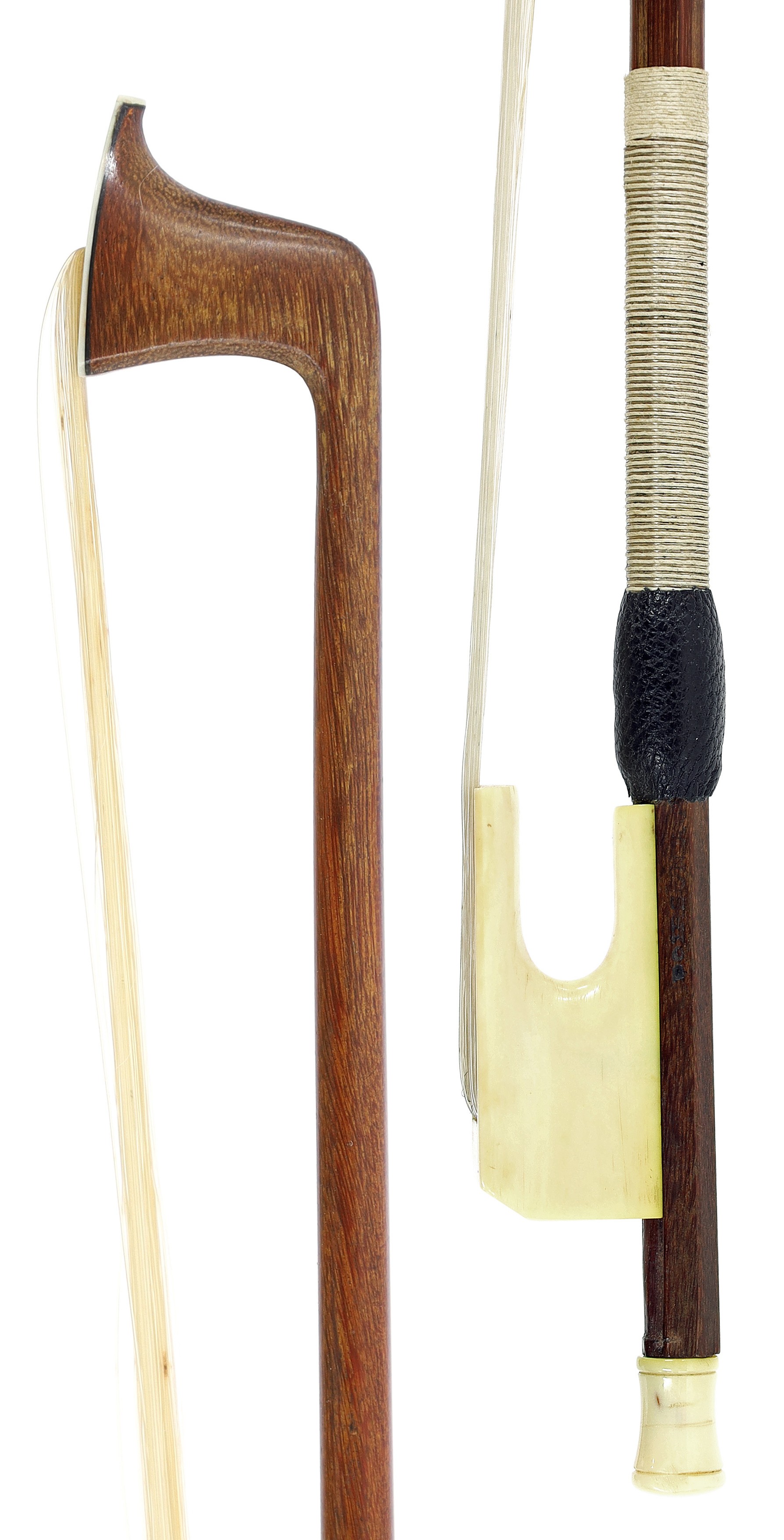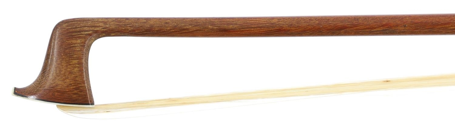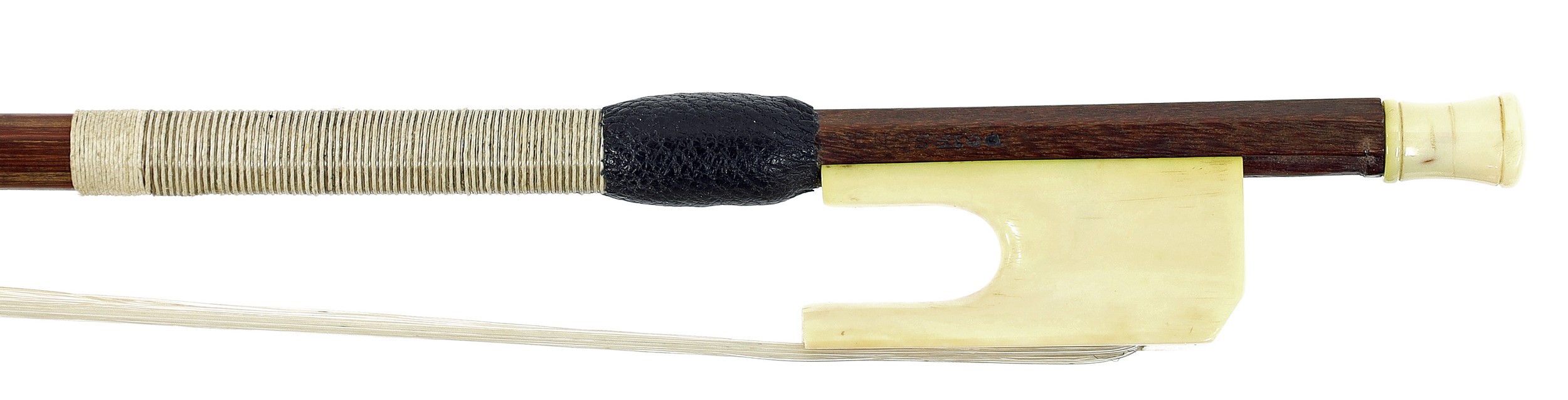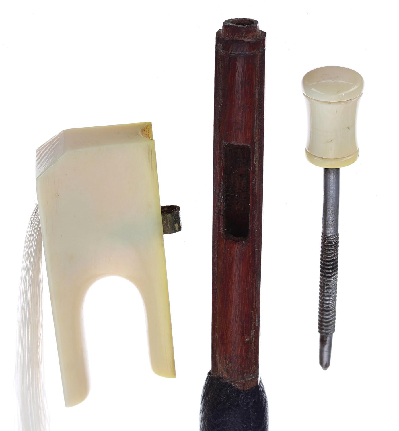 French ivory mounted violin bow by and stamped Poirson á Paris on both sides of the handle, the stick round, the ivory frog plain and with a turned ivory adjuster, 50gm