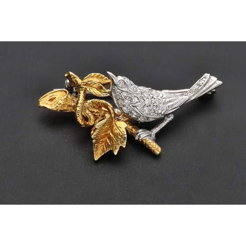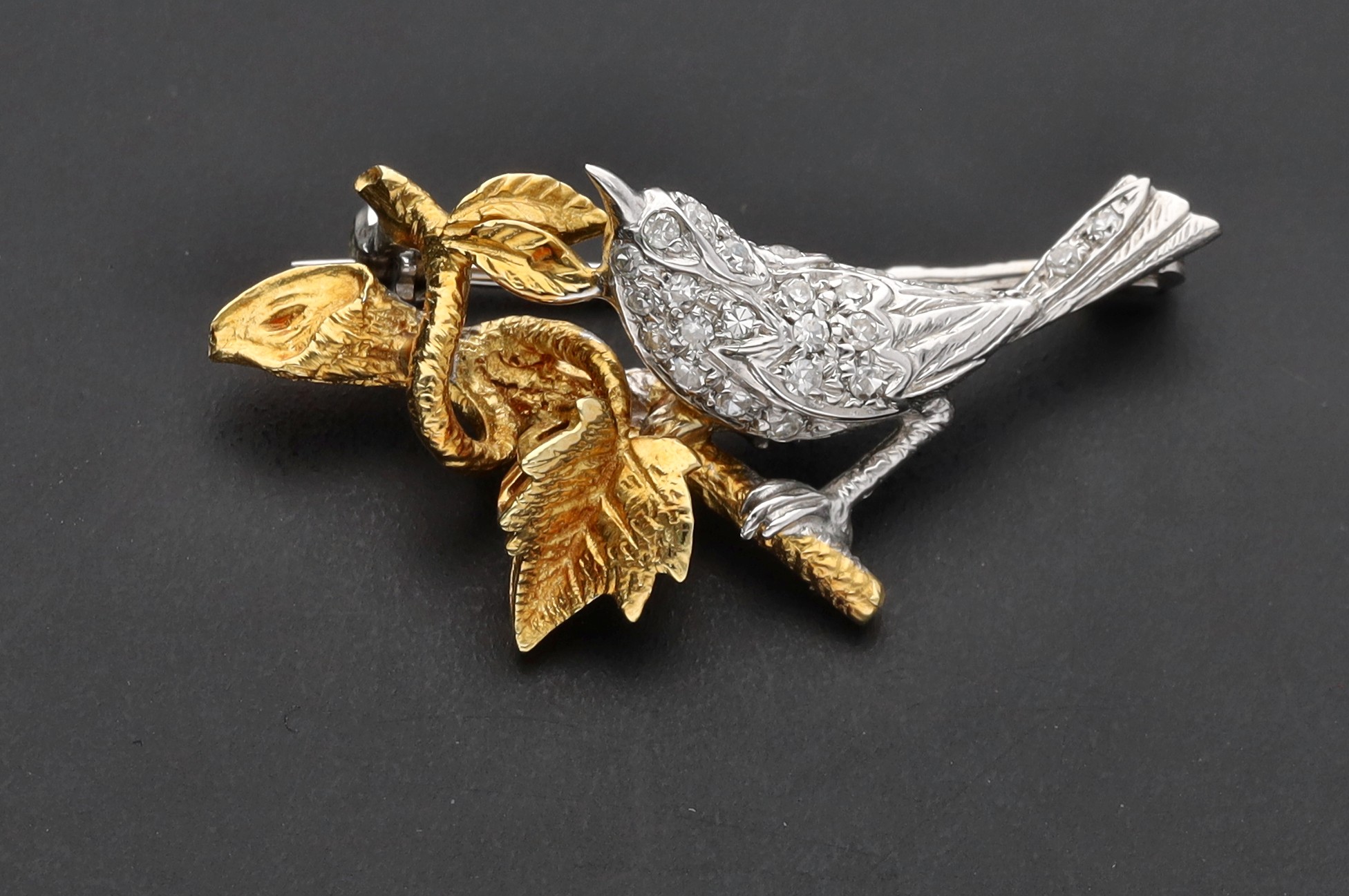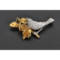 Novelty 18ct bicolour diamond set bird brooch, 4gm, 30mm x 14mm