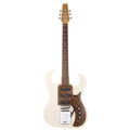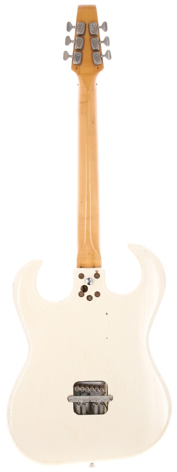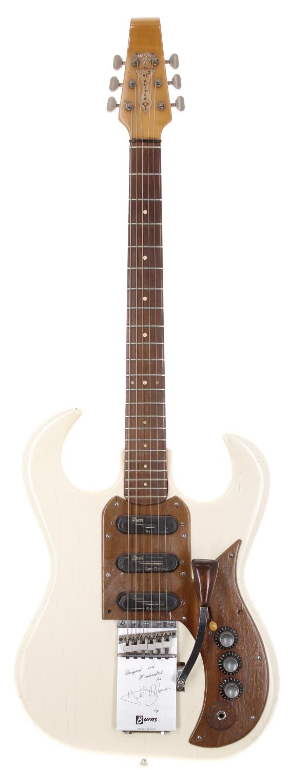 Modified 1960s Burns Bison electric guitar; Body: white poly finished body, typical cracking, various dings etc; Neck: maple, vacant tuner holes to back of head, both 'Marvin' and 'Jazz Guitar' Perspex badges pinned to head face; Fretboard: rosewood; Frets: light wear; Electrics: working, some crackle to pots and switch, Burns Rez-o-Matik pickups; Hardware: non-Burns wooden pickguard (damages), Burns Hank Marvin trem system, Burns control knobs and tuners, missing serial neck plate and tremolo back plate; Weight: 3.47kg; Overall condition: fair