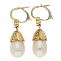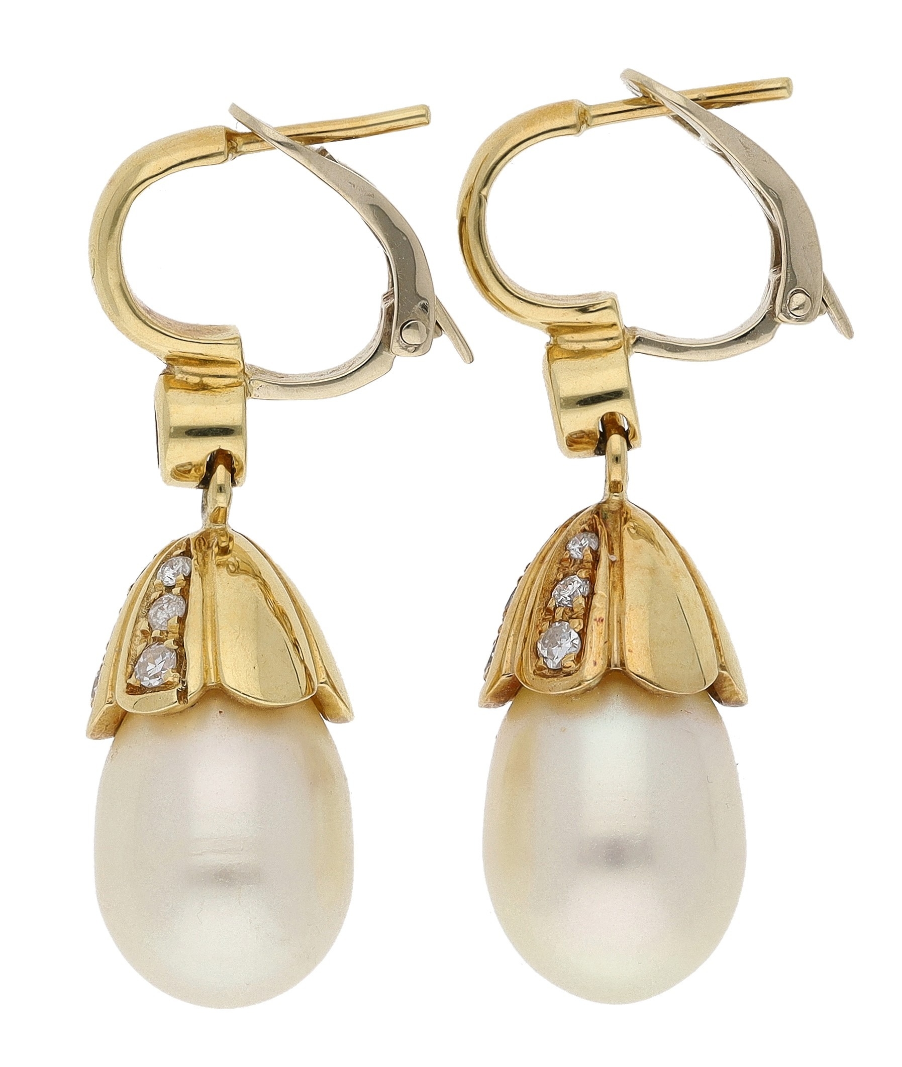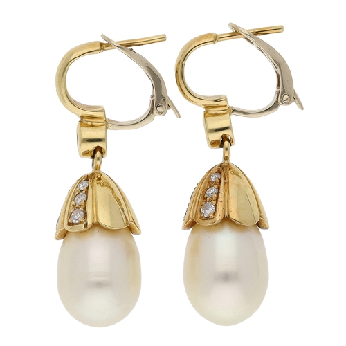 Pair of 18ct diamond and cultured pearl pear shaped drop earrings, clip and post backs, 13gm, the pearls 10mm, drop 36mm (340)