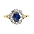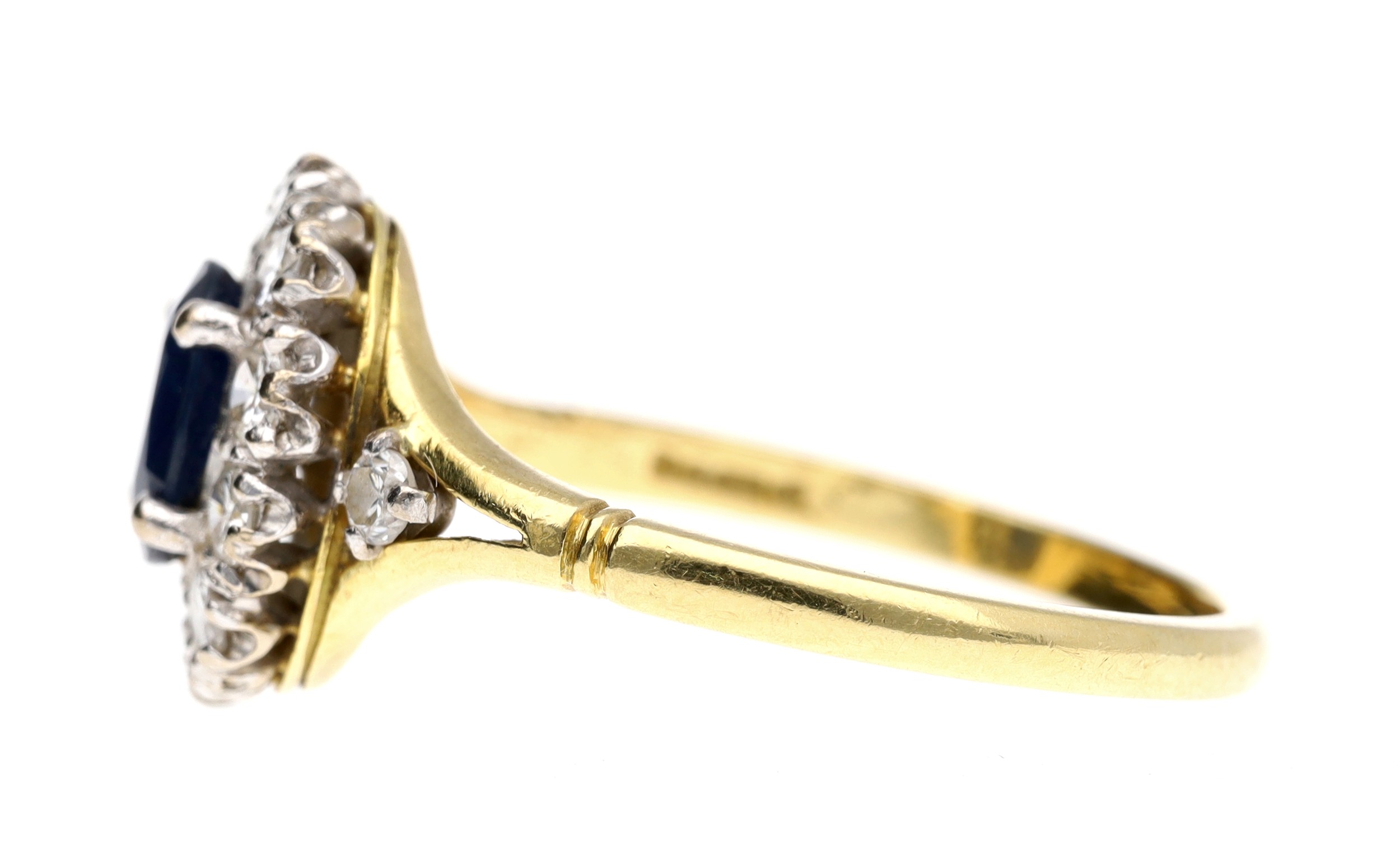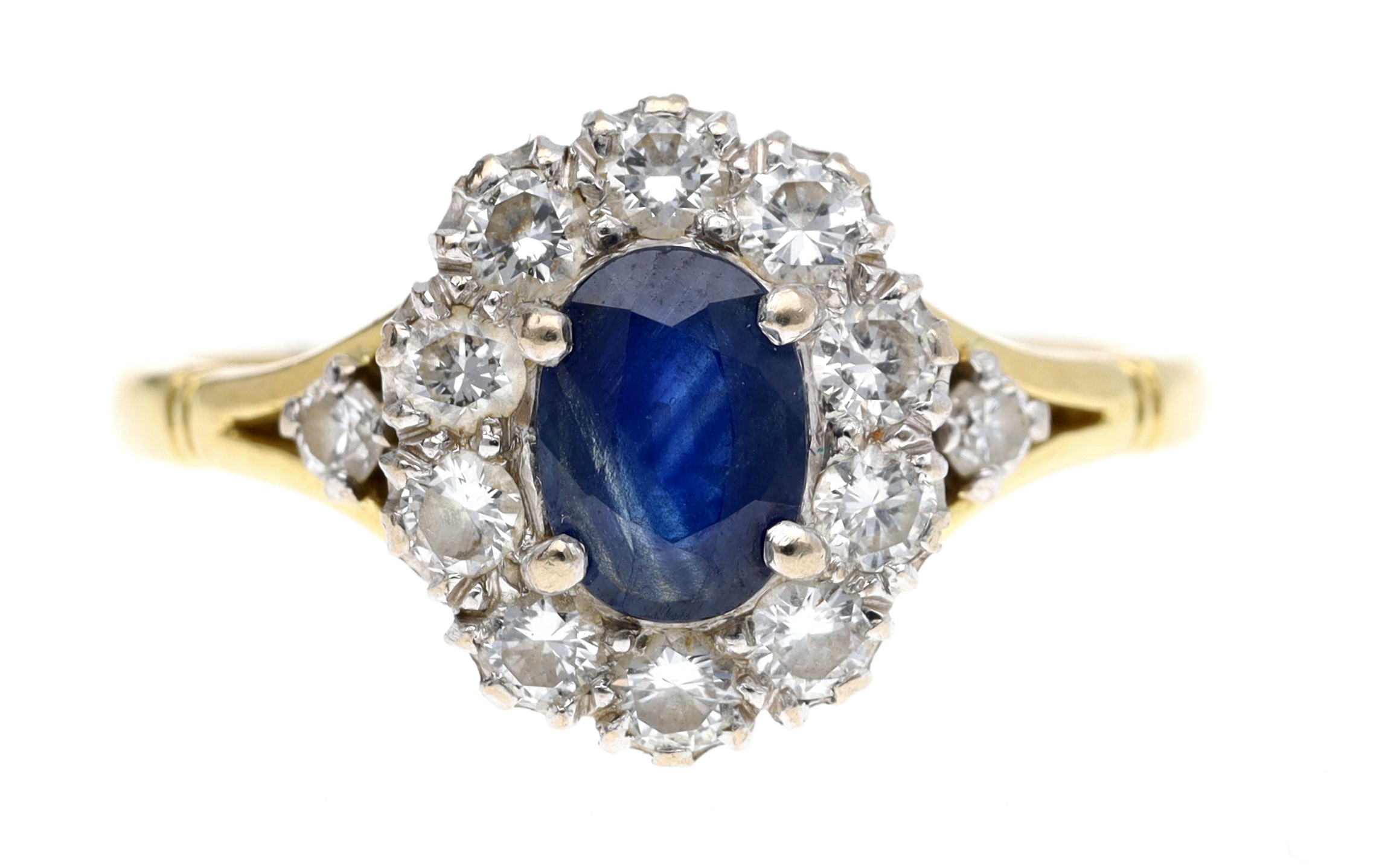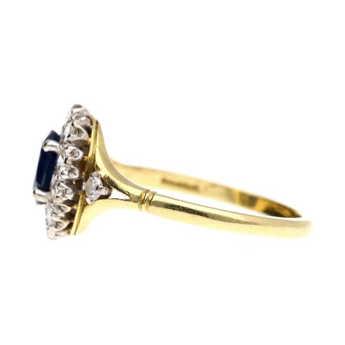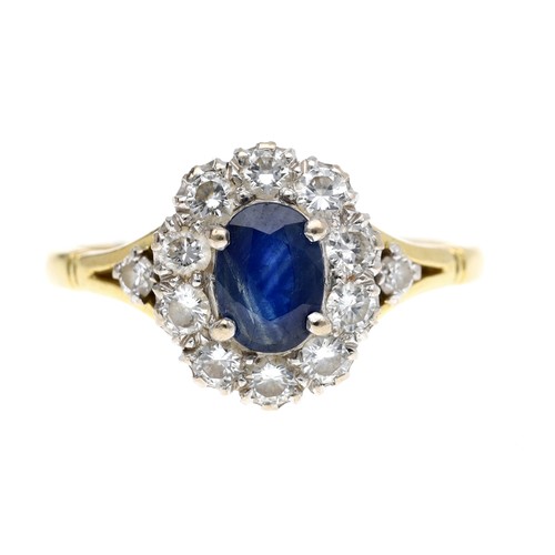 Attractive 18ct oval sapphire and diamond cluster ring, the sapphire 0.75ct approx, within a border of round brilliant-cut diamonds, 0.60ct approx in total, 12.5mm x 11mm, 4.4gm, ring size R