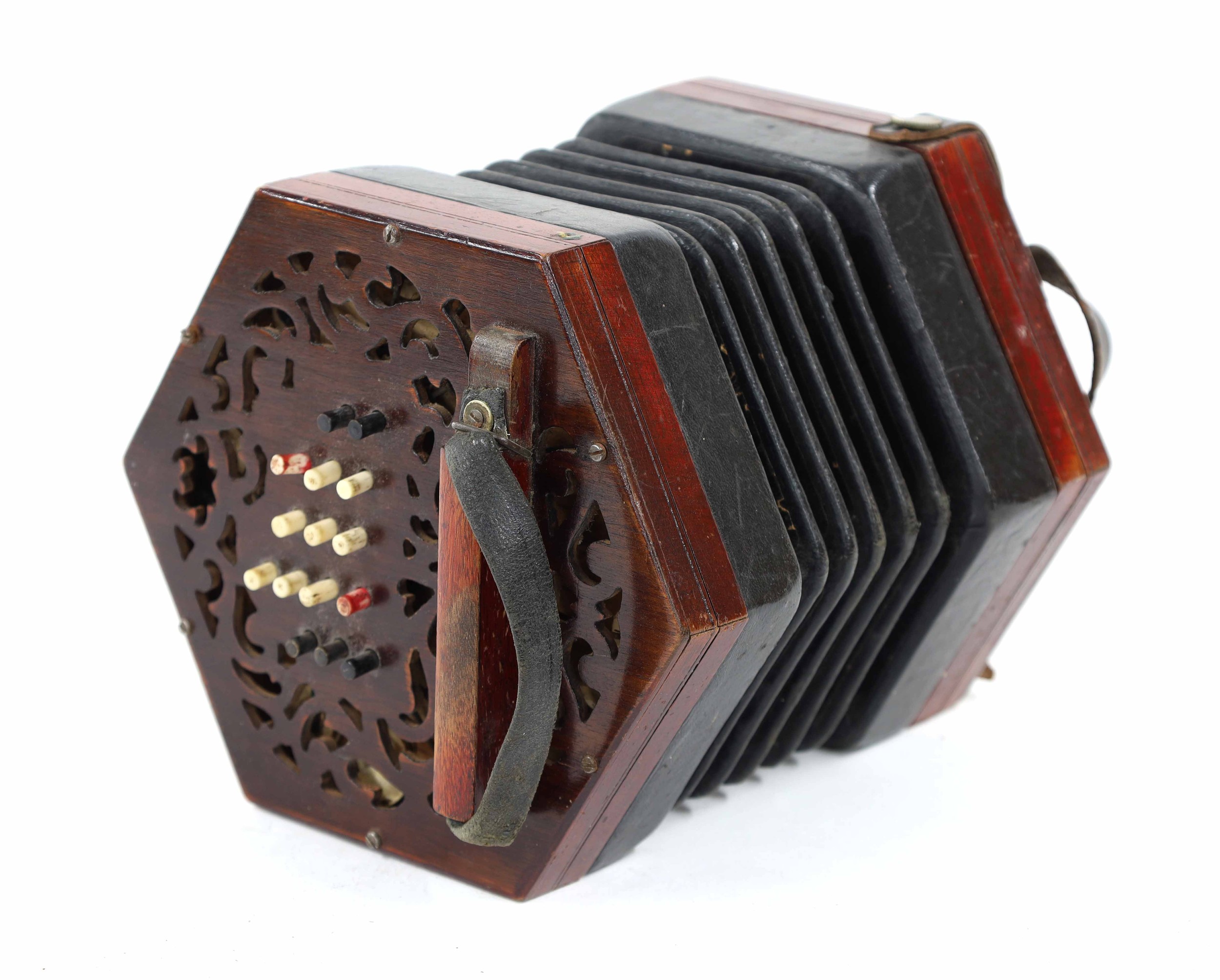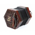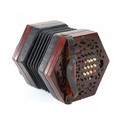 Lachenal & Co Crane Duet concertina, with thirty-five bone buttons on foliate pierced rosewood ends, five-fold bellows