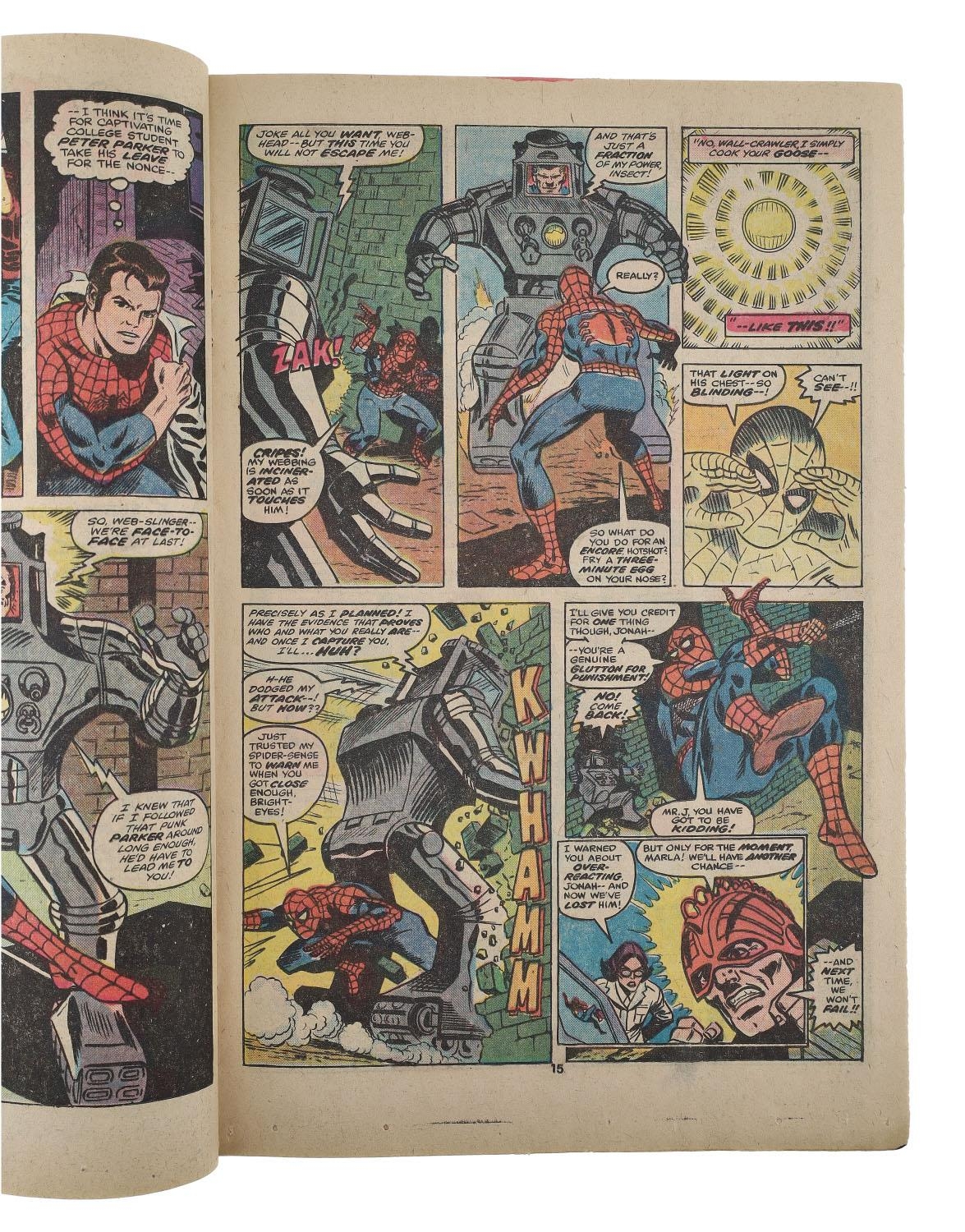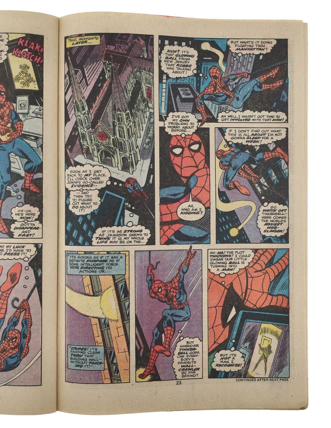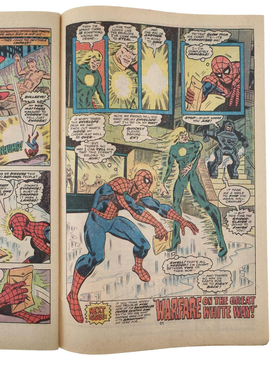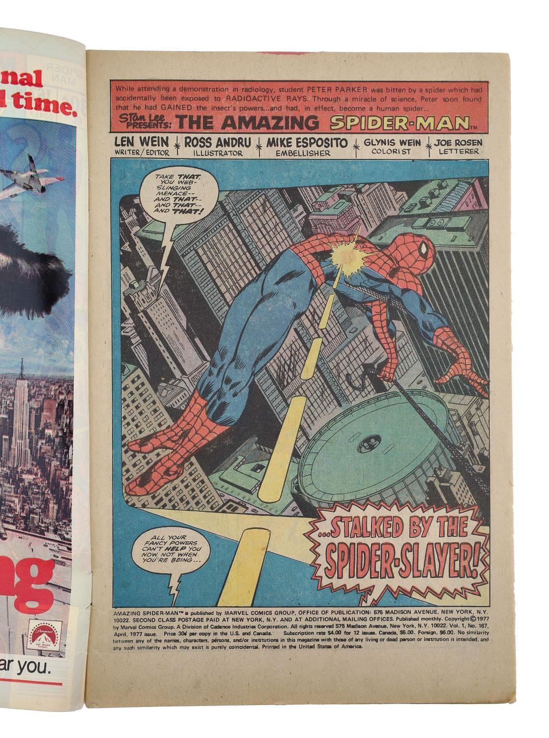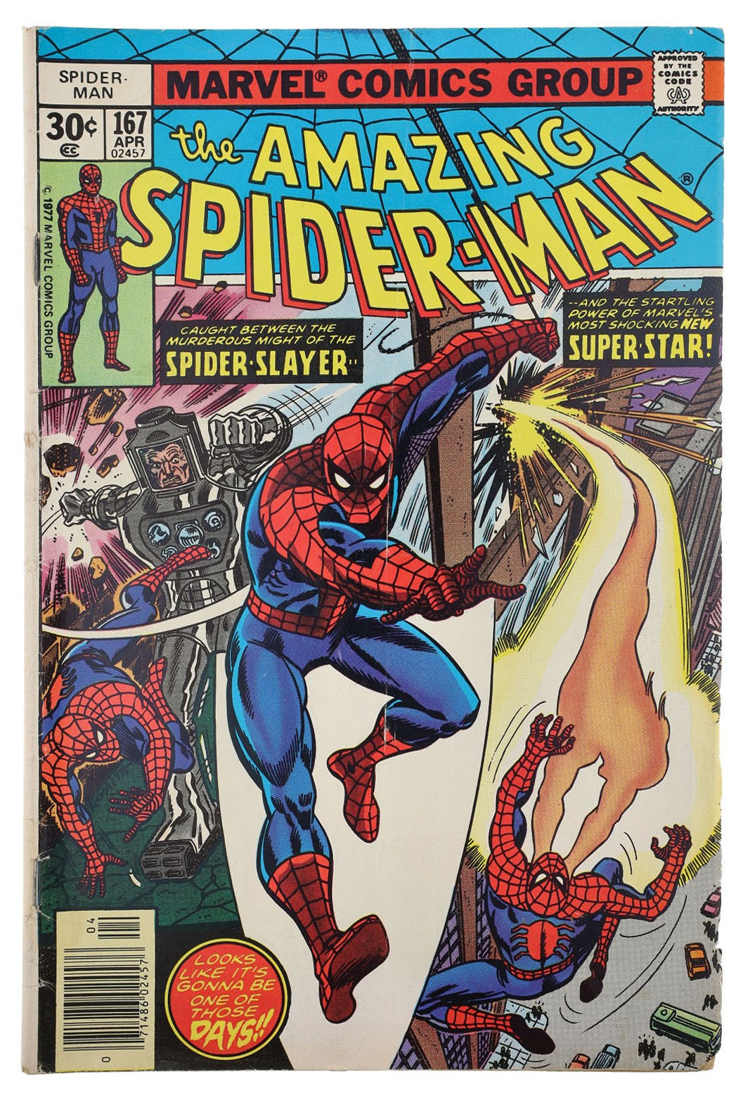 Marvel Comics, The Amazing Spider-Man issue #167, circa 1977, first appearance of Will O' Wisp and an appearance from the Spider-Slayer, story by Len Wein & cover art by John Romita