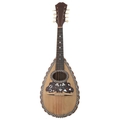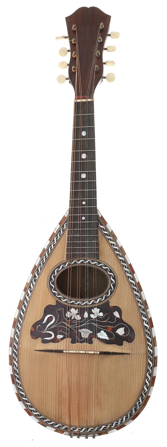 Old Neapolitan mandolin labelled Concert 3, with decorative faux tortoiseshell and mother of pearl banded spruce table and scratchplate, soft case
