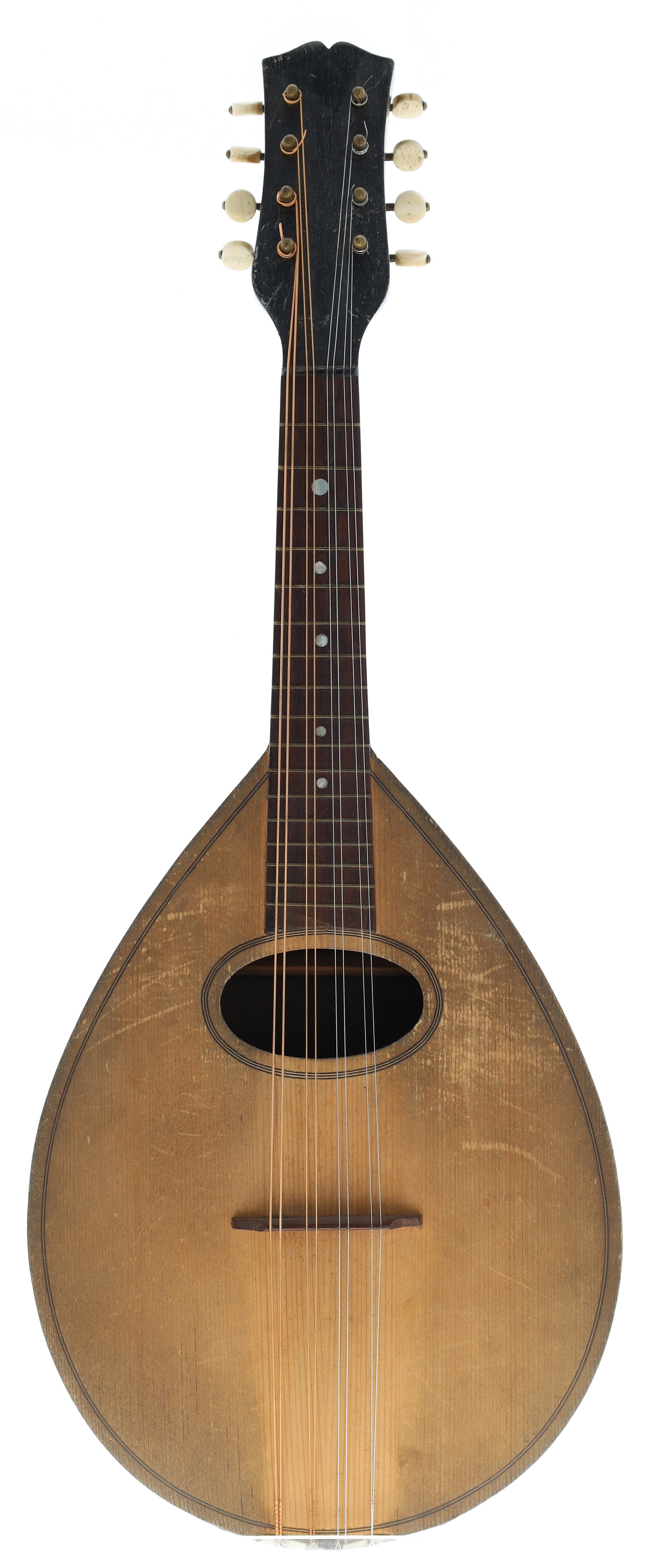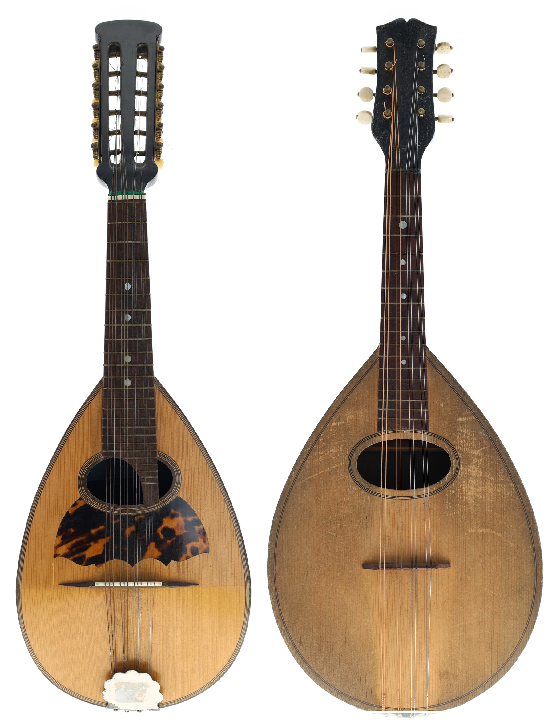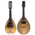 Neapolitan twelve string mandolin labelled Carlo Ricordo, Napoli, N.1000/8..., with rosewood bowl back, spruce table and faux tortoiseshell scratchplate, case; also an old flatback pear shaped mandolin, unnamed, associated case (2)