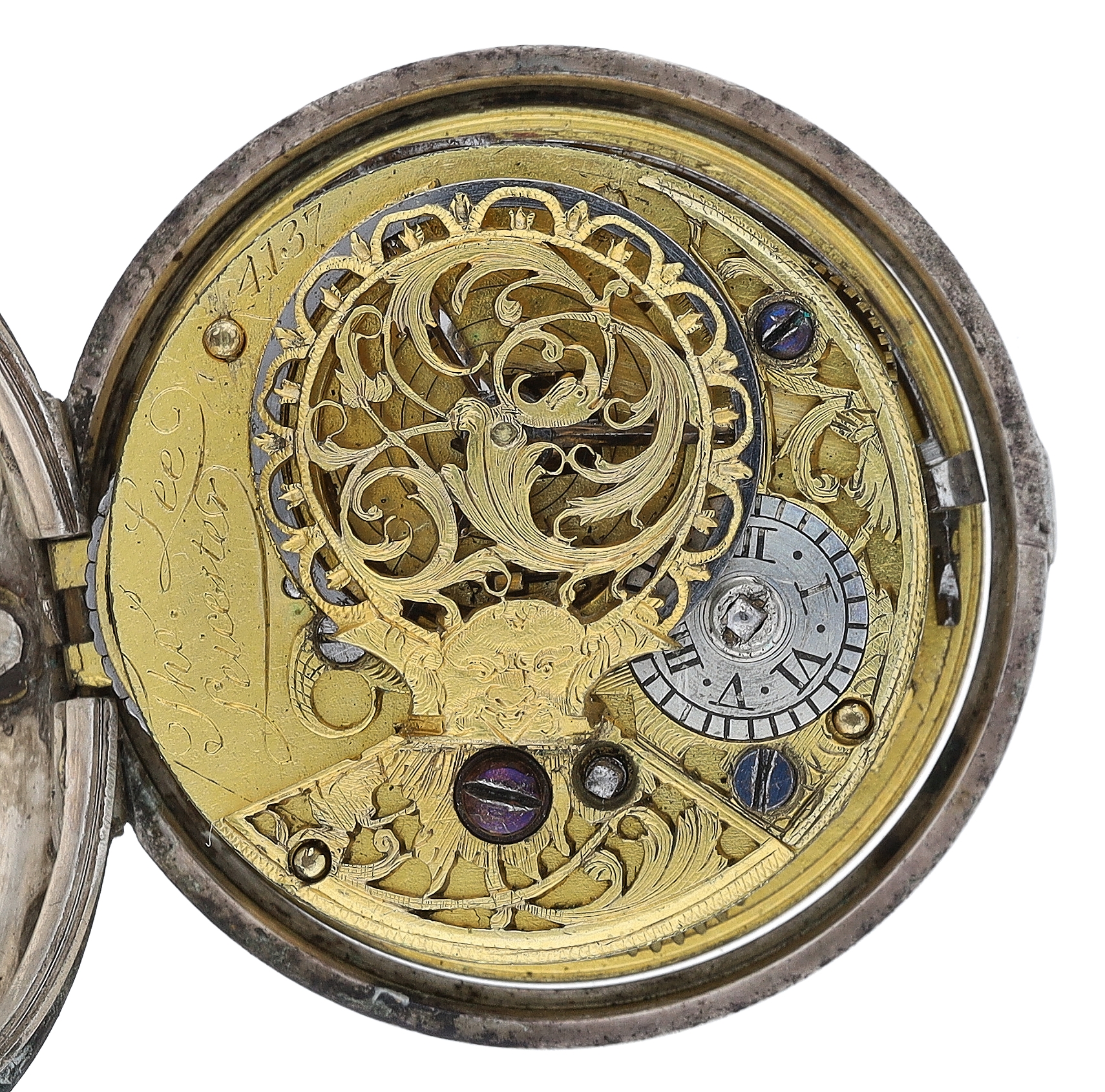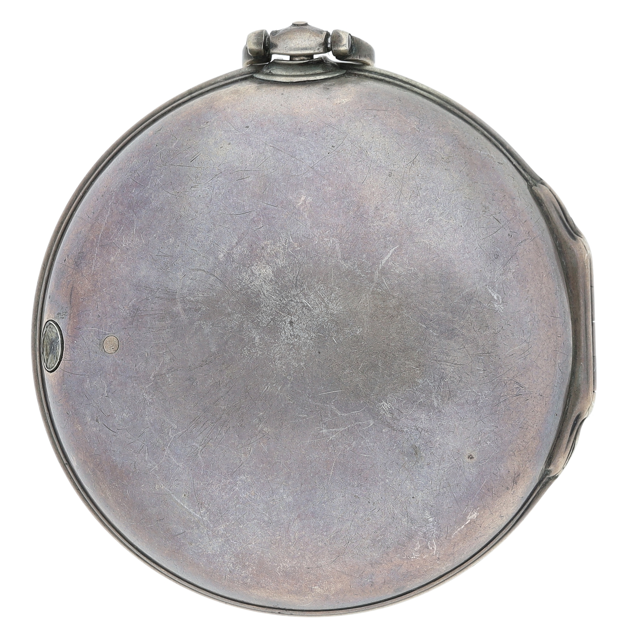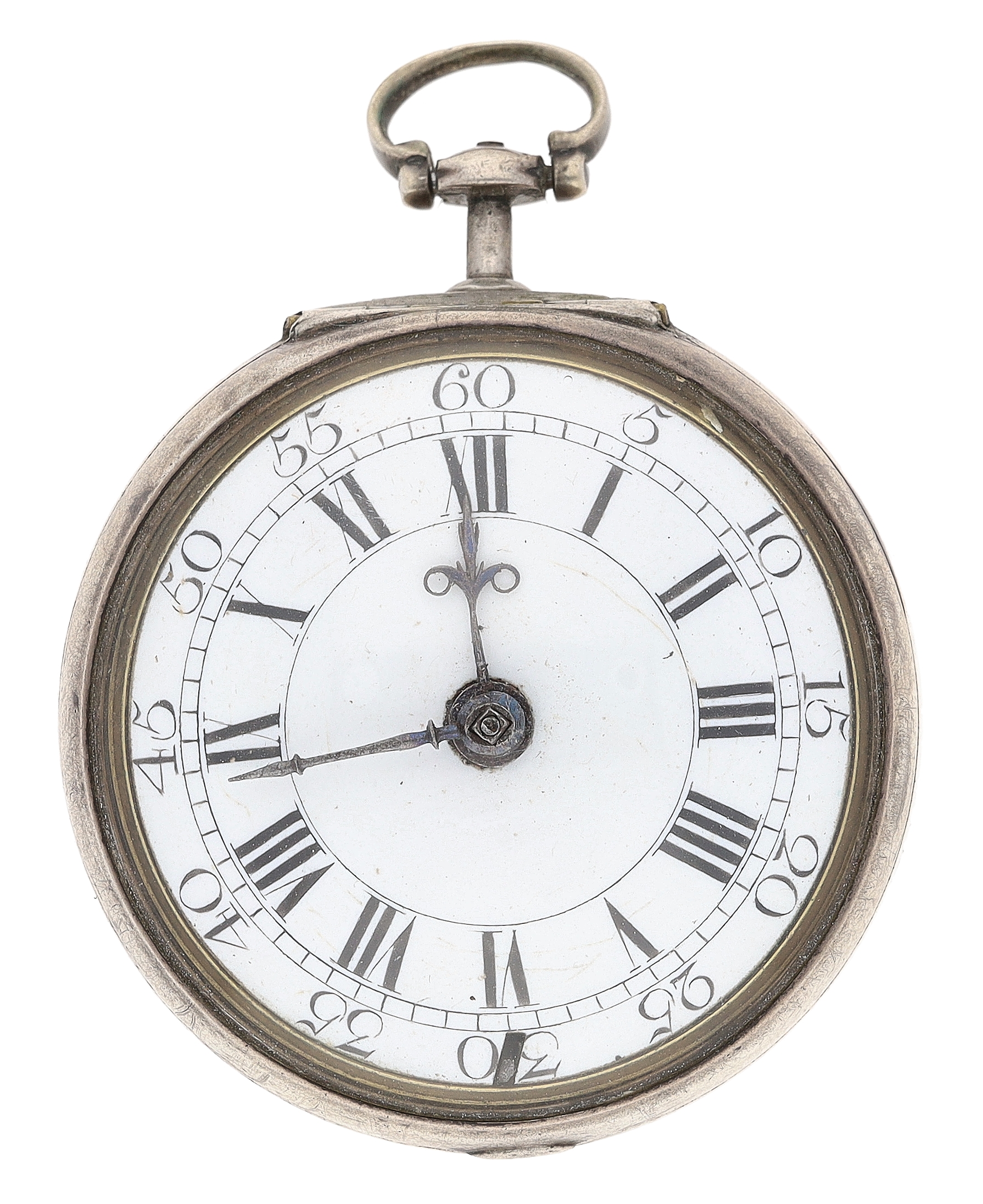 Thomas Lee, Leicester - George III silver pair cased verge pocket watch, circa 1770, No. 4137, signed fusee movement, three-arm balance, pierced and engraved balance cock, silver regulating dial and square baluster pillars, enamel Roman numeral dial with with outer Arabic minute numerals, beetle and poker hands, plain cases, case maker 'R.P', 51mm