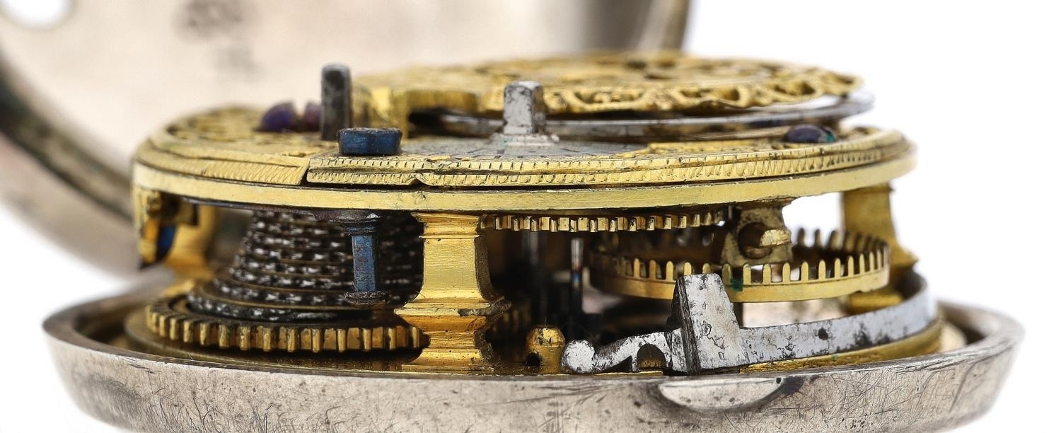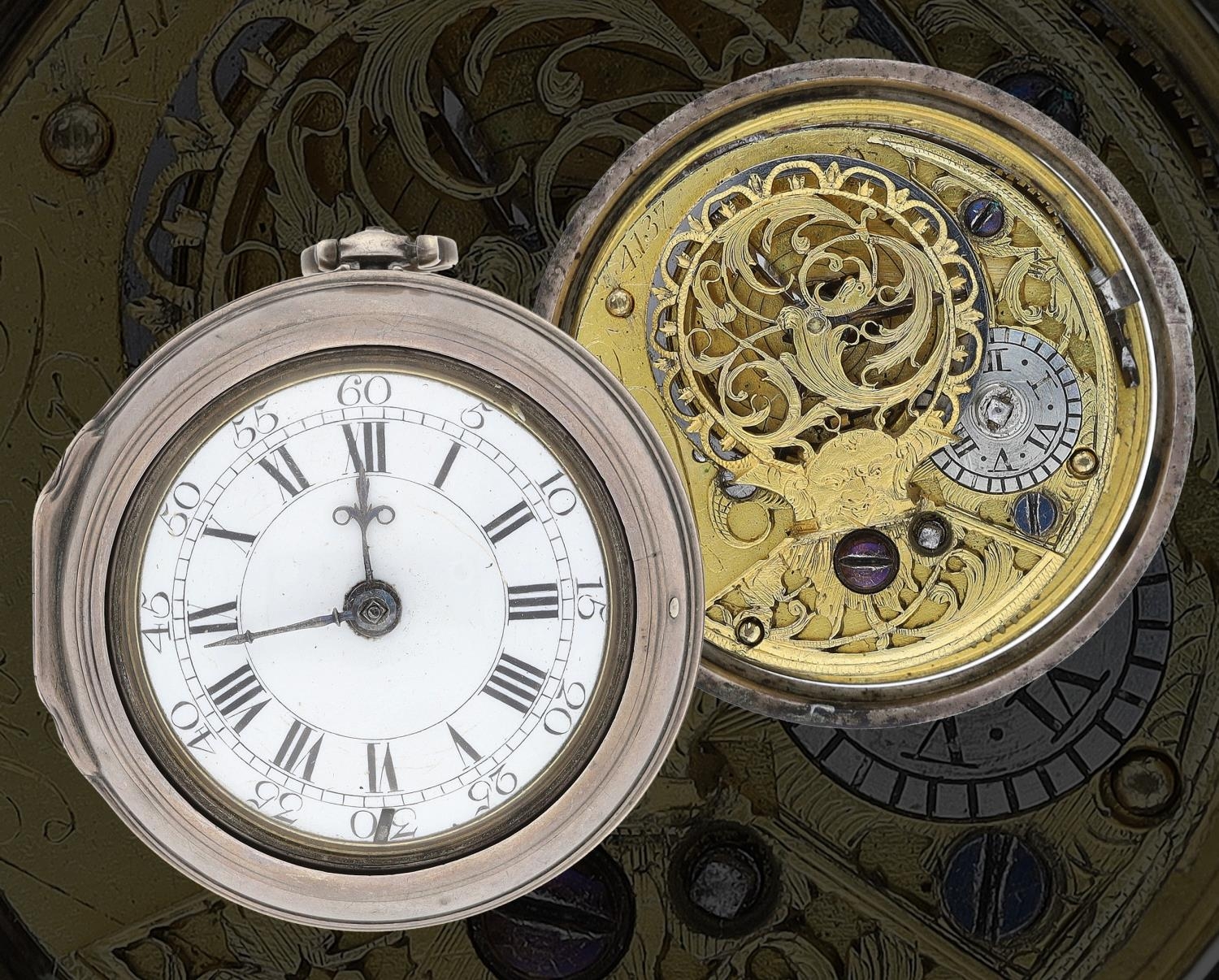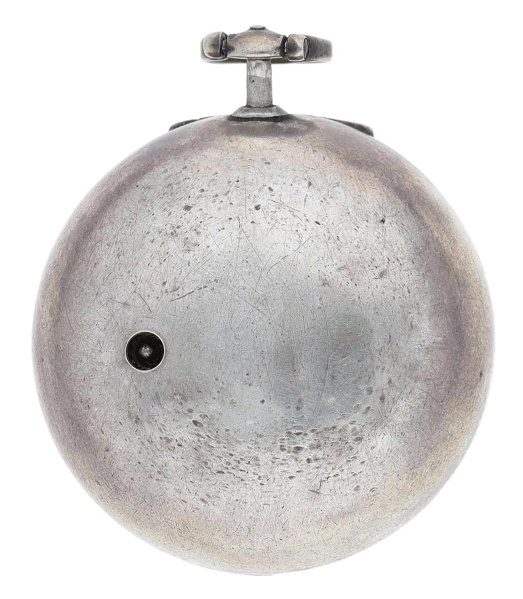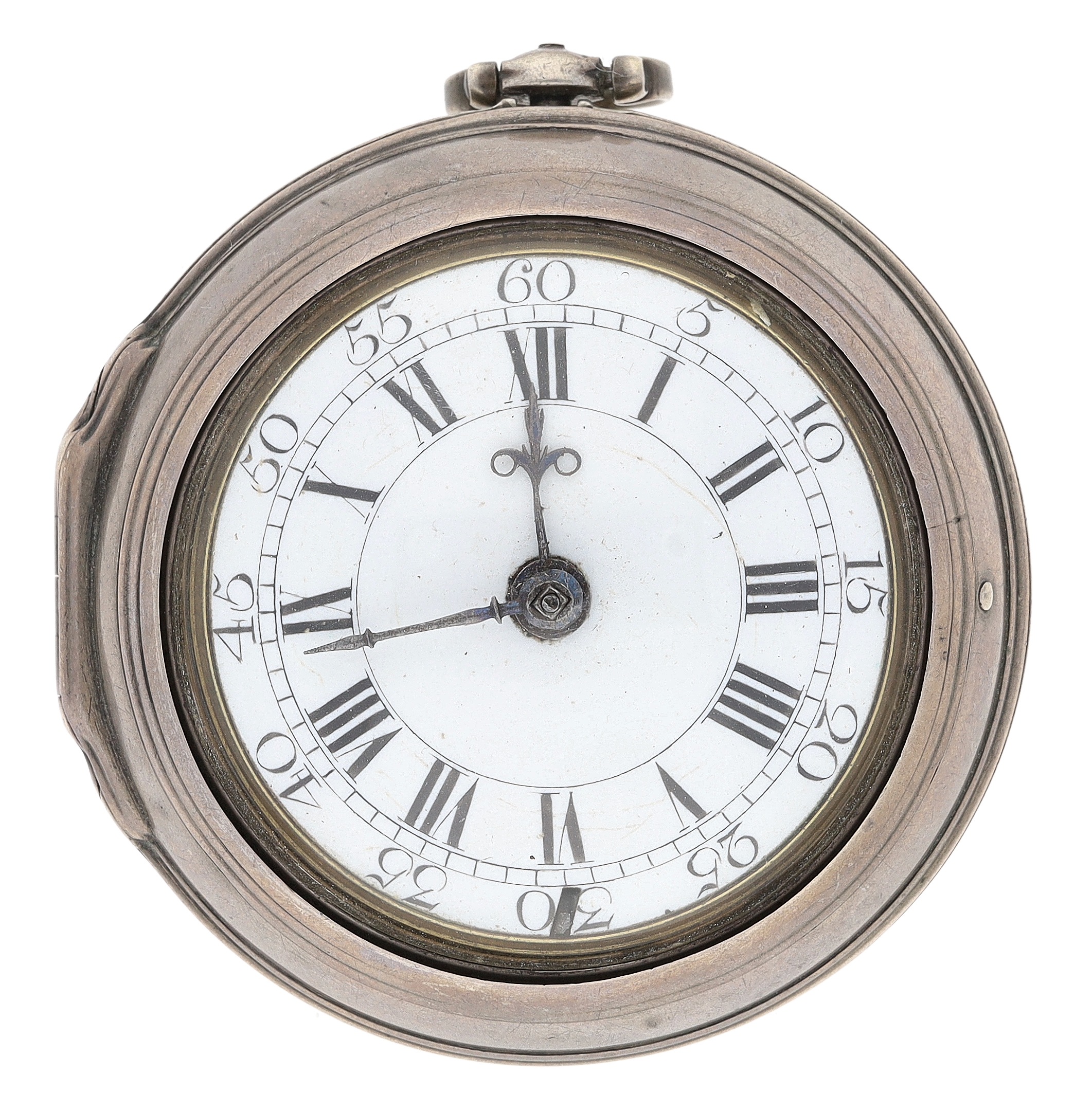 Thomas Lee, Leicester - George III silver pair cased verge pocket watch, circa 1770, No. 4137, signed fusee movement, three-arm balance, pierced and engraved balance cock, silver regulating dial and square baluster pillars, enamel Roman numeral dial with with outer Arabic minute numerals, beetle and poker hands, plain cases, case maker 'R.P', 51mm