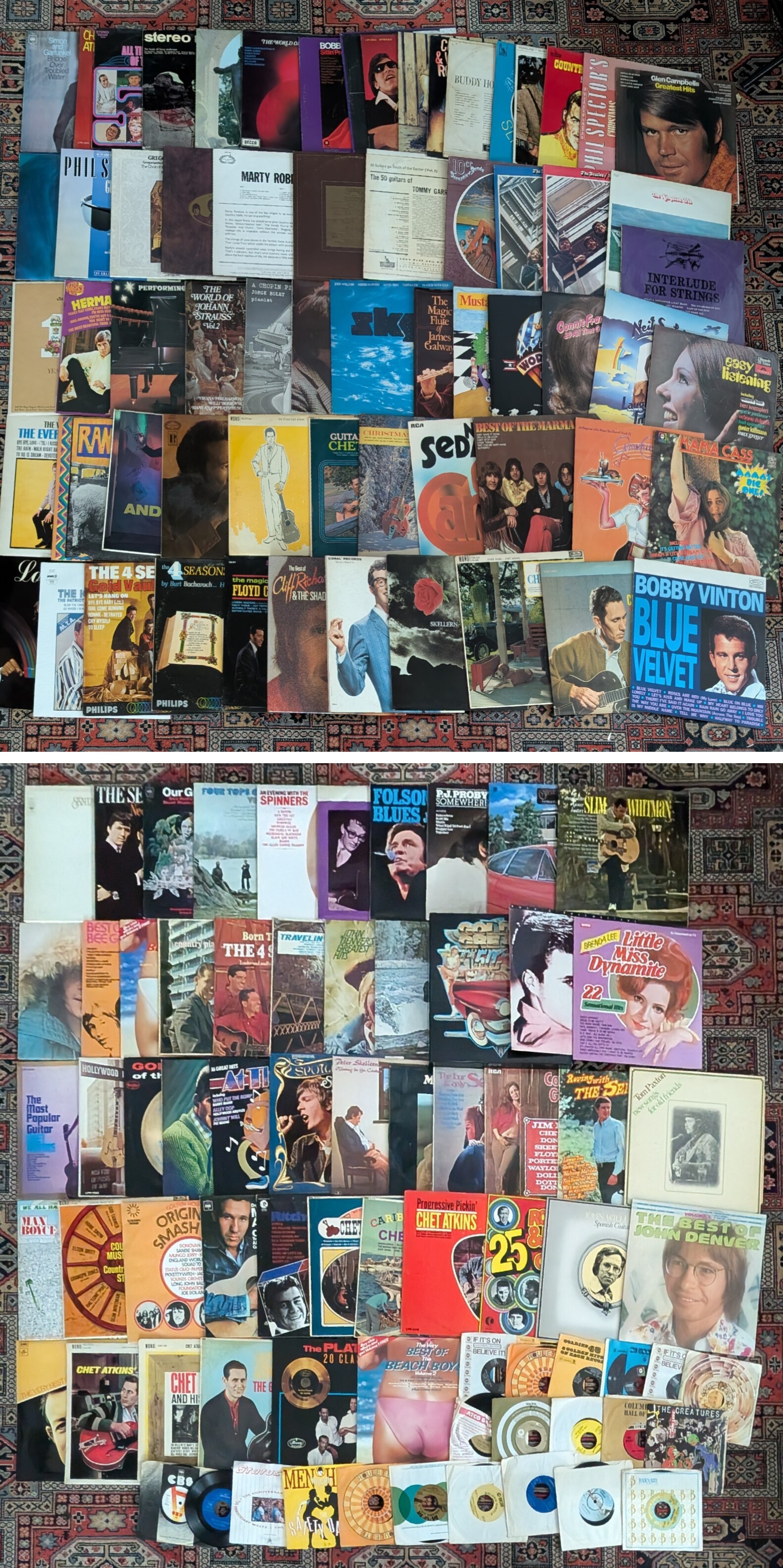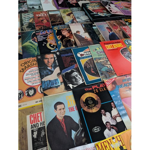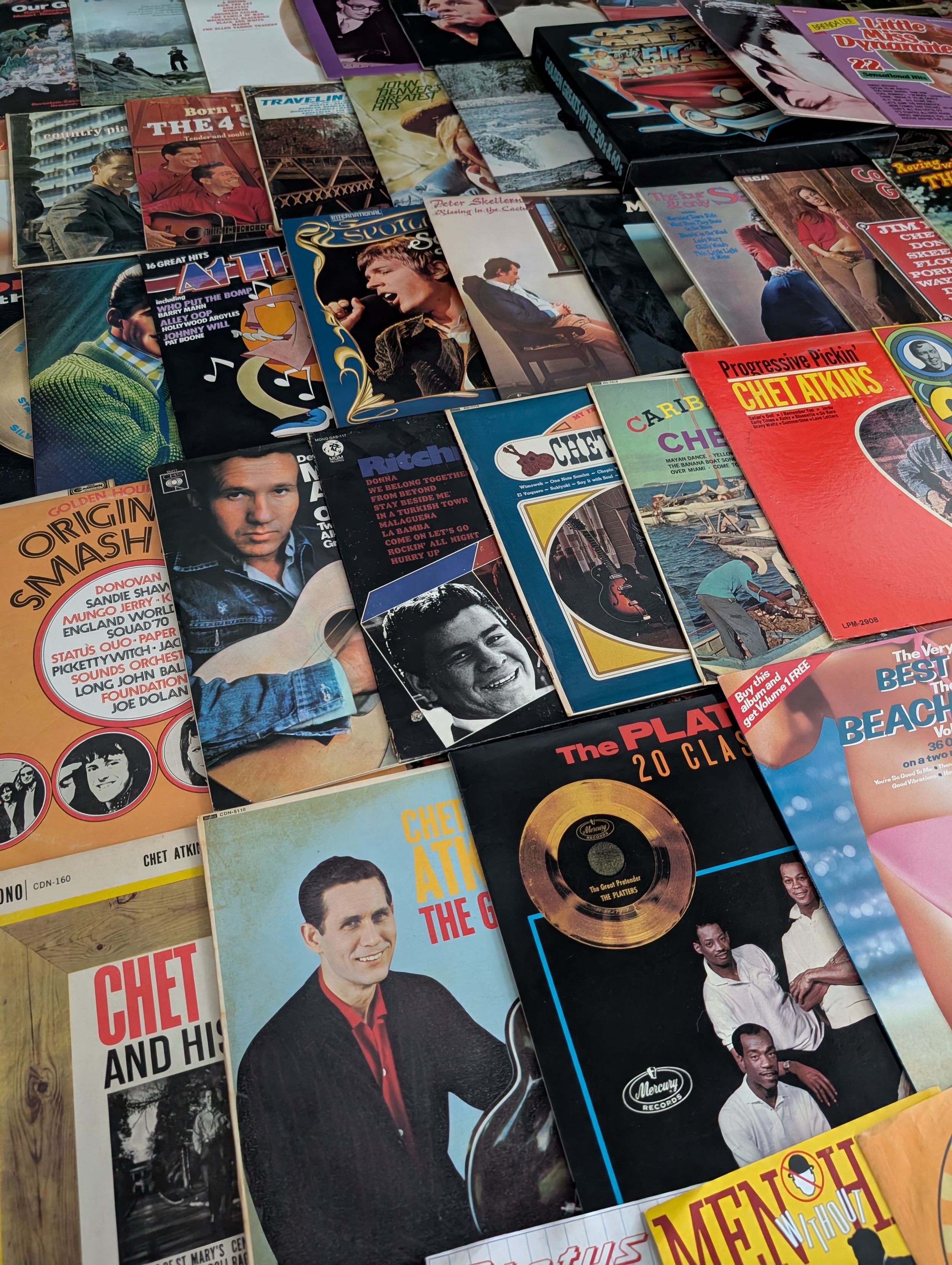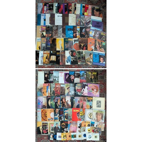 Selection of vinyl LP records, artists including Simon & Garfunkel, Chet Atkins, Buddy Holly, Glenn Campbell, Phil Spector, Carpenters, 10cc, The Beatles, Roy Wood, Cliff Richard & The Shadows, John Denver, Beach Boys, Bee Gees, Johnny Cash, The Searchers, Santana; together with a small selection of 45rpm singles including a Chuck Berry Chess label, Status Quo and others