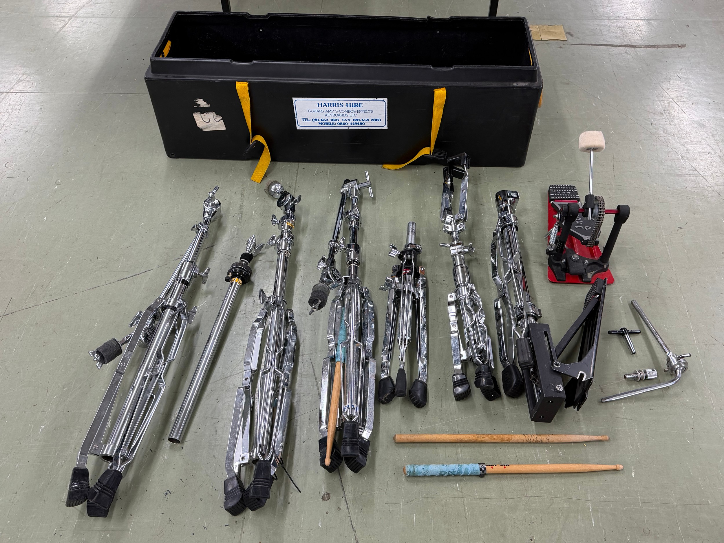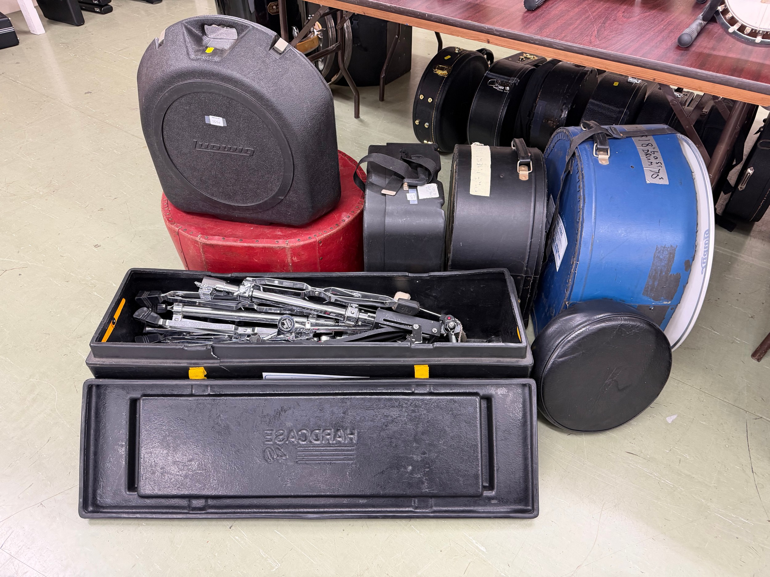 Quantity of drum hardware, cased; also a rare Ludwig snare drum case, four other drum cases, two drum skins and a stool