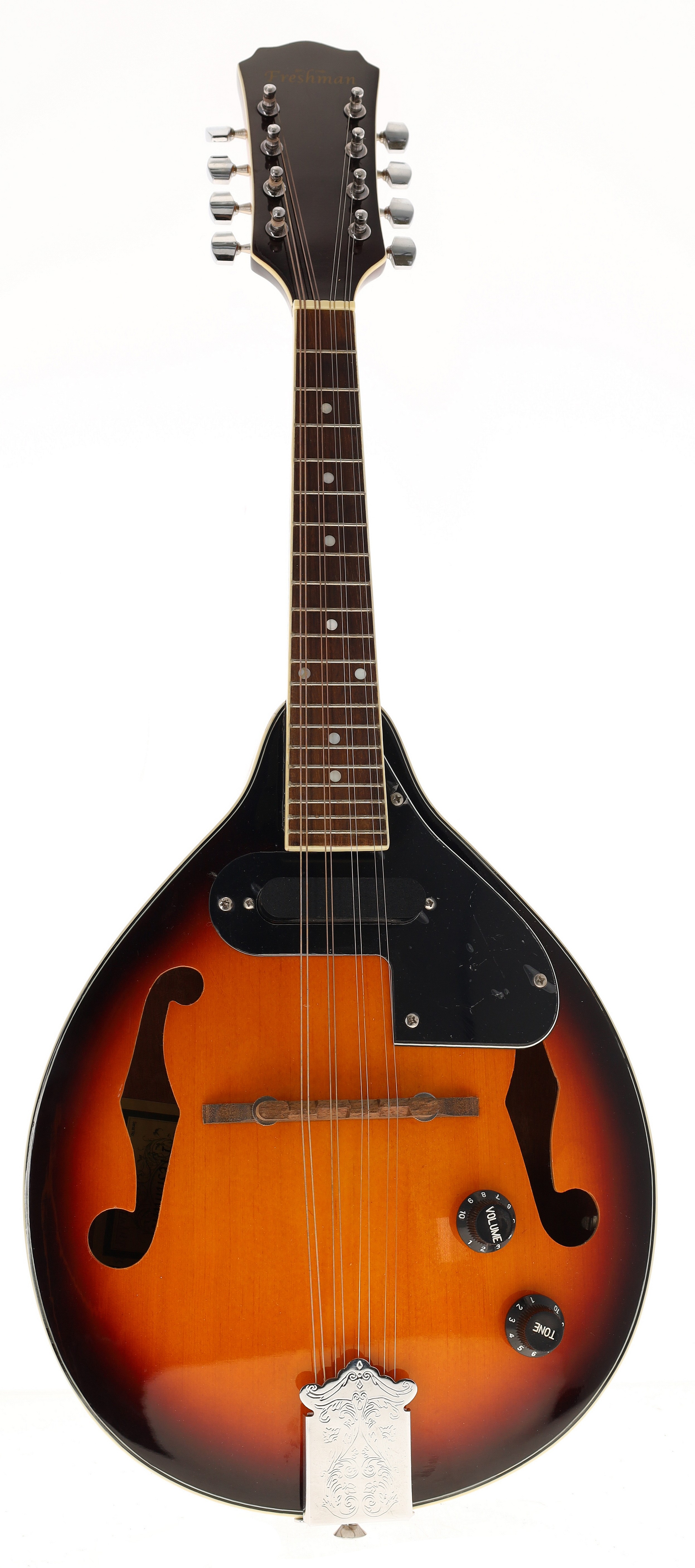 Freshman electric pear shaped mandolin labelled Freshman, Model FMAN 2E/BS, sunburst finish, soft case