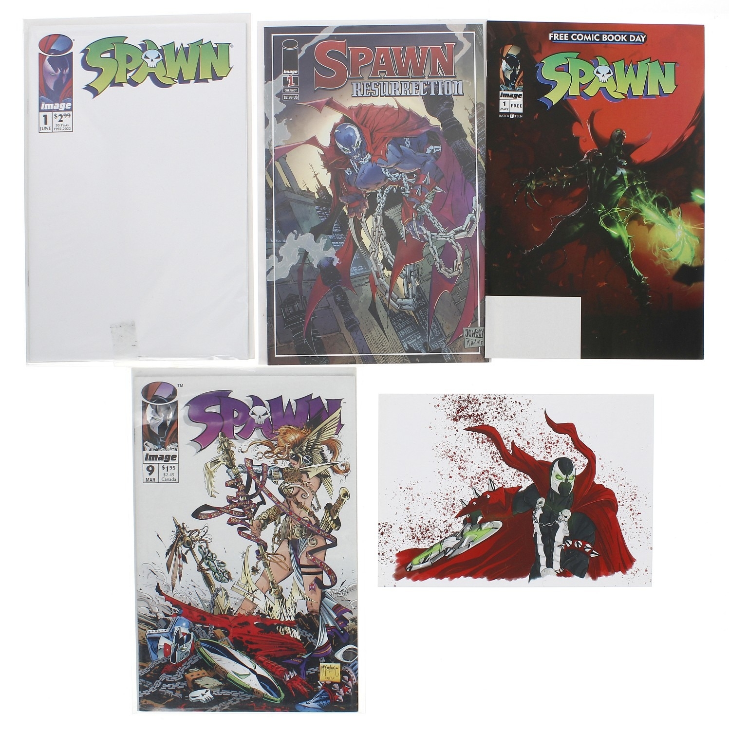 Image Comics, Spawn Resurrection issue #1, circa 2015, McFarlane cover B, together with three other Spawn comics to include issues #9 1st appearance of Angela, #1 & #1 Todd McFarlane (Virgin 30th anniversary variant)