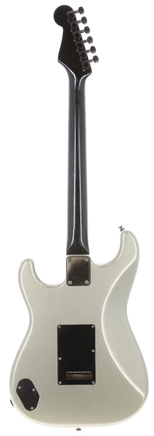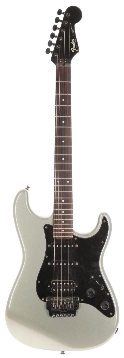 Fender Contemporary Series Stratocaster HSS electric guitar, made in Japan, circa 1985; Body: metallic pewter finish, various light dings and minor surface scratches; Neck: black finish, good; Fretboard: rosewood; Frets: light wear, tarnishing to upper frets; Electrics: working; Hardware: missing string lock from head, missing trem arm; Case: gig bag; Weight: 3.64kg; Overall condition: fair