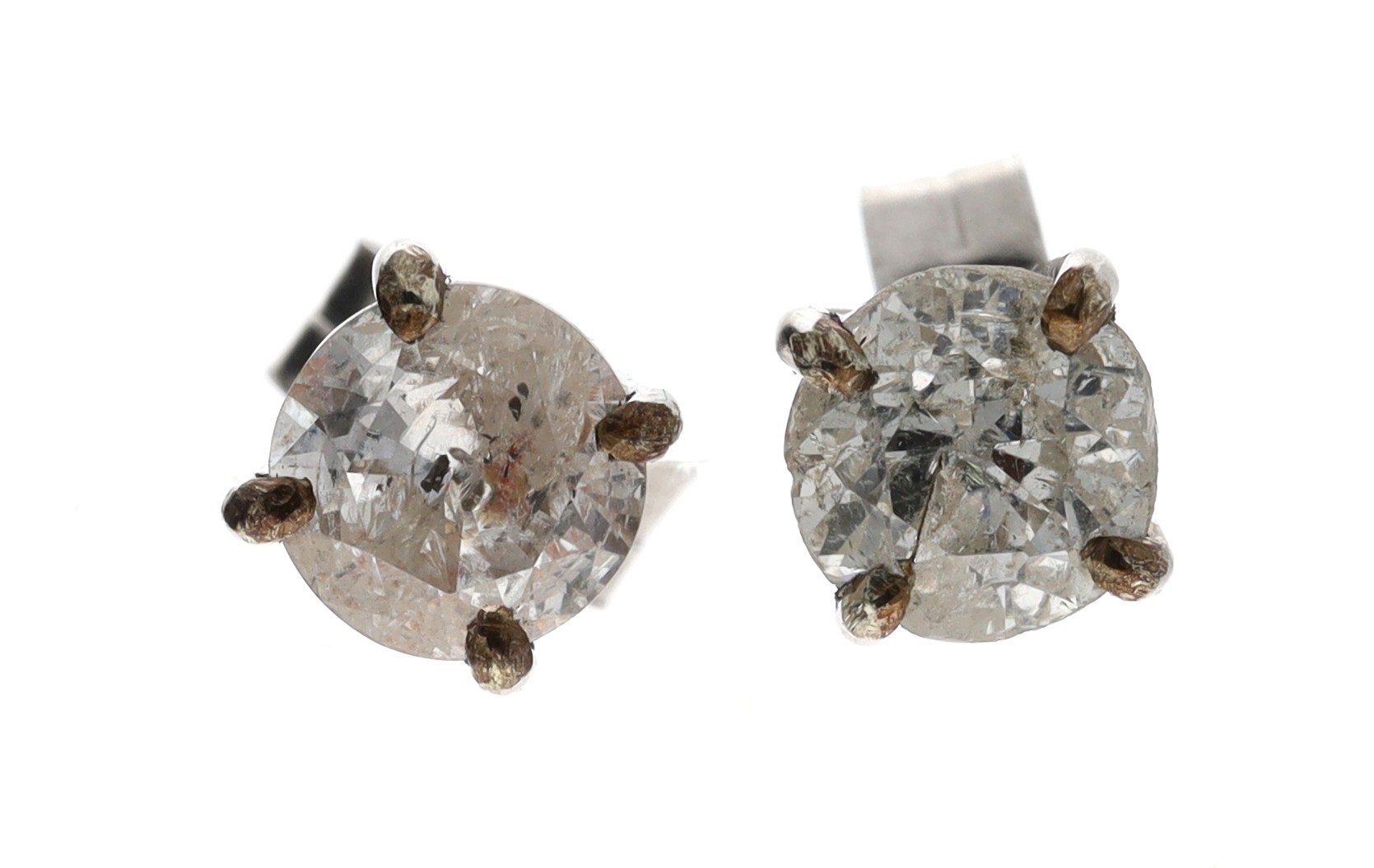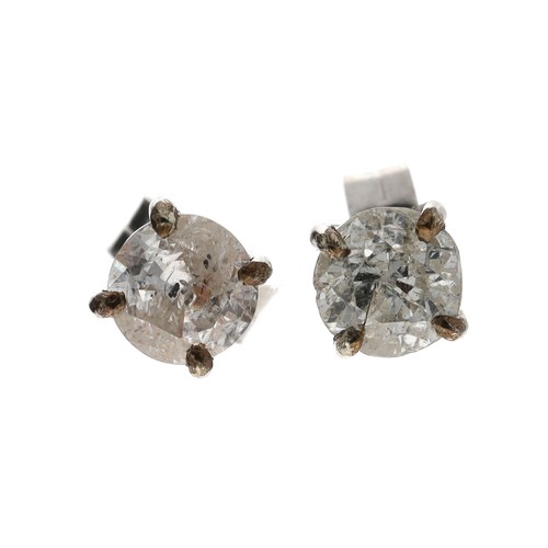 Pair of 9ct white gold diamond stud earrings, round brilliant-cuts, 1.00ct approx in total, clarity I1-2, colour G, post and butterfly back, 1.2gm, 5mm