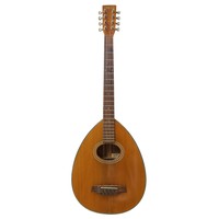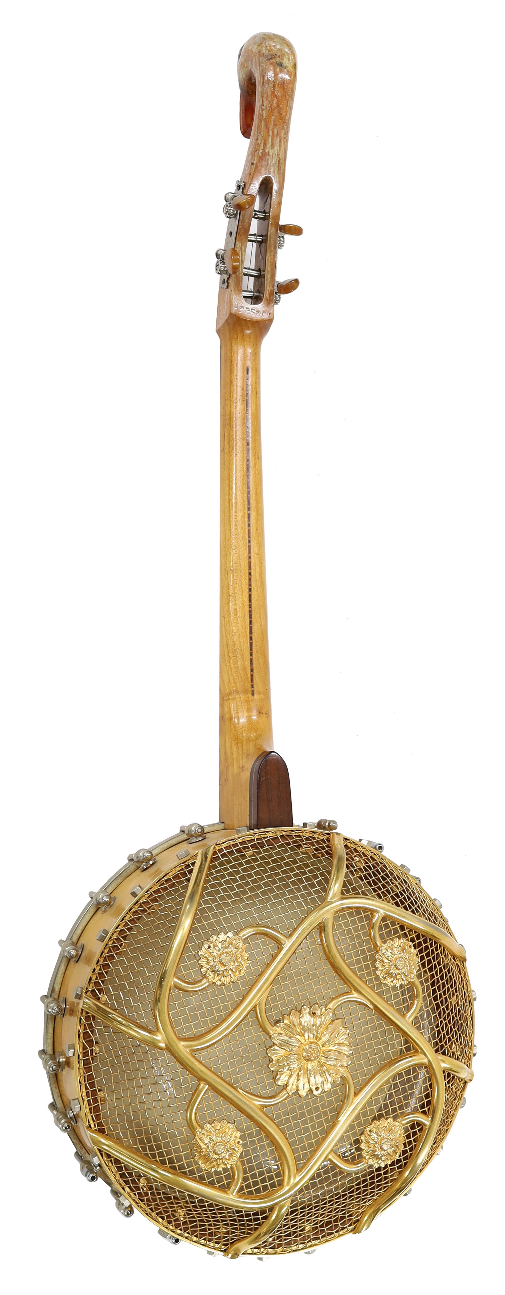 Unusual and possibly unique four string banjo stamped Georges Carcassonne, Paris on the heel, the pierced gilded mesh back applied in relief with flowering foliage, with 12" skin, mother of pearl position dot markers to the fretboard and the open peg box with duck head finial stamped Hees & Cie verso