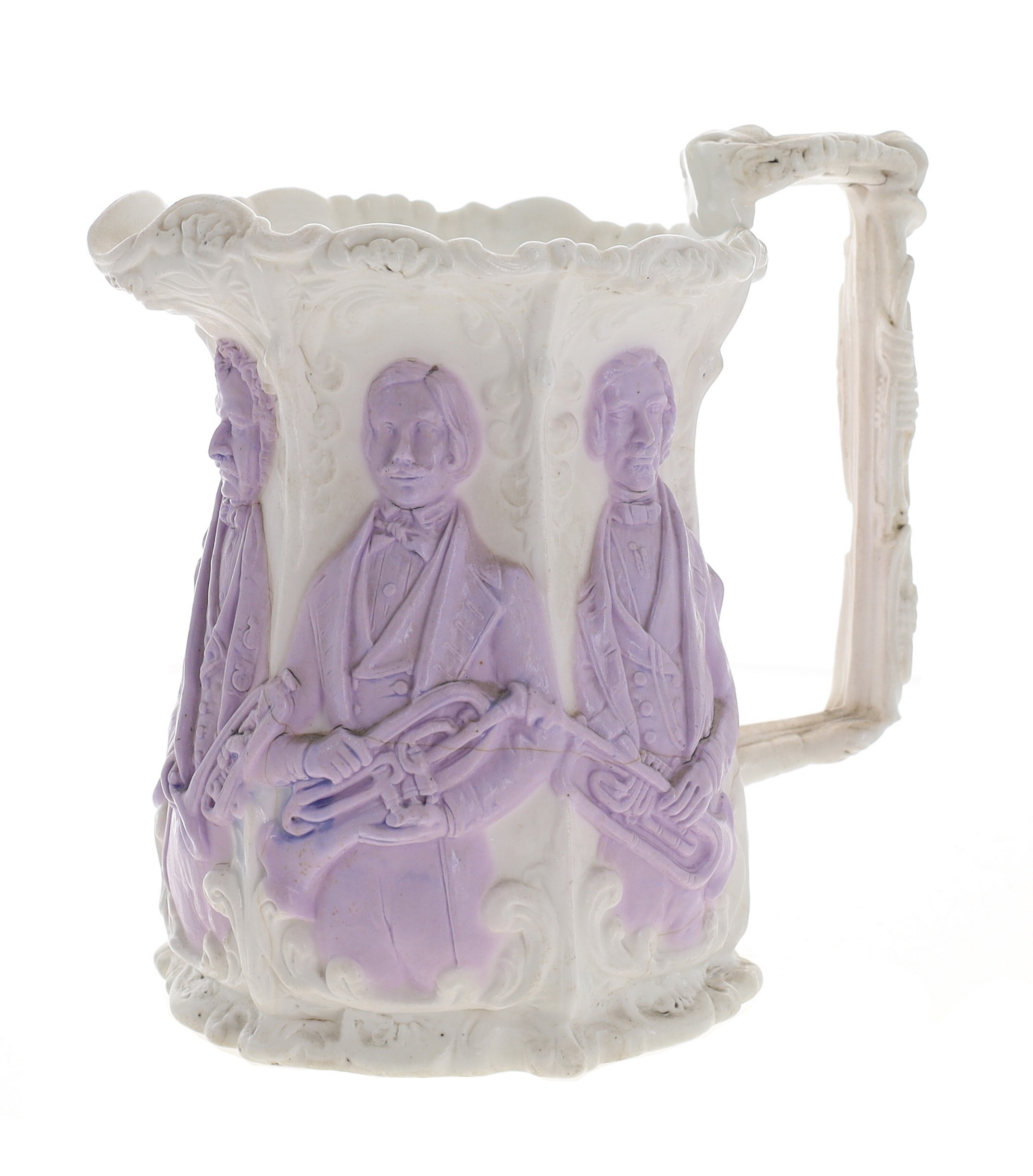 Mid 19th century Staffordshire pottery jug, moulded in relief with John Distin and his four sons holding instruments made for them by Adolphe Sax, inscribed beneath Patent 135 under the Royal Coat of Arms, 15cm high