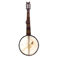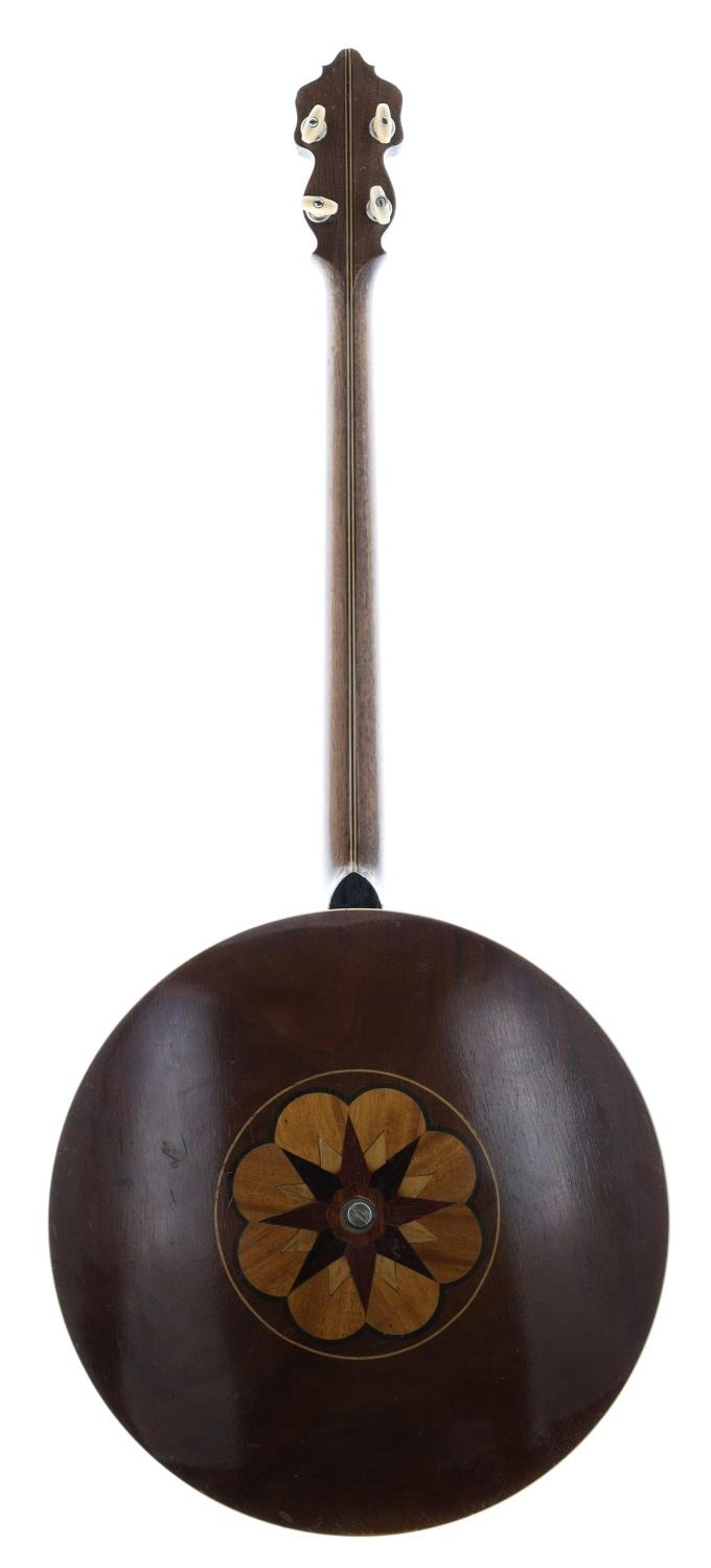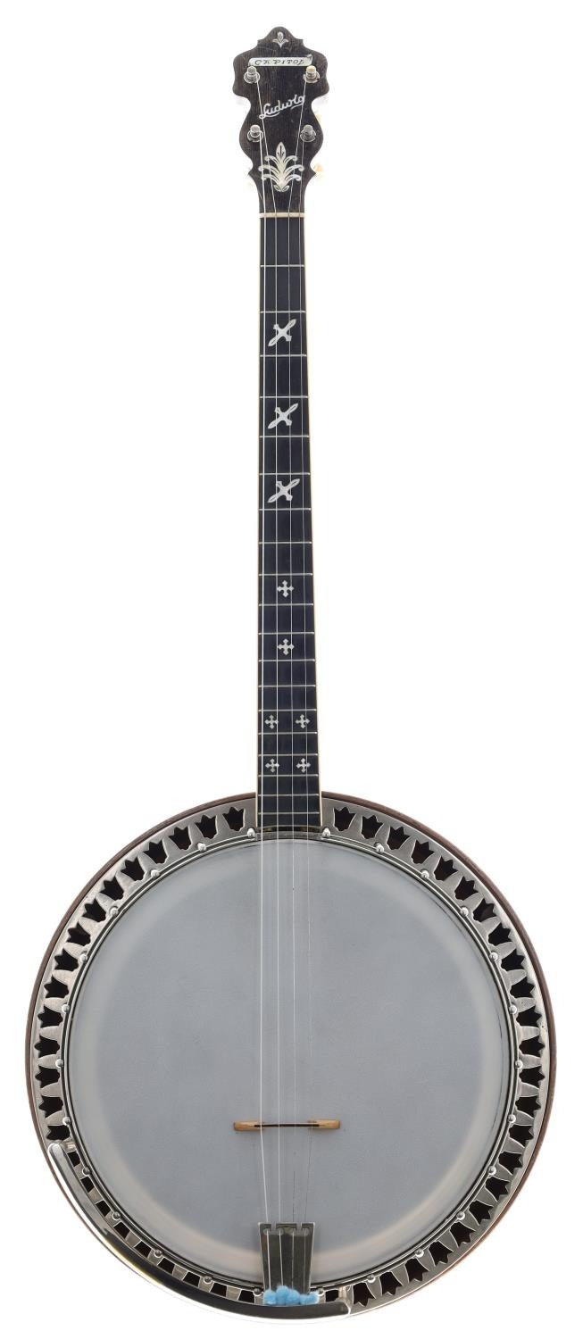 Ludwig Capitol tenor banjo, ser. no. 4990, with marquetry inlaid flowerhead to the centre of the banded resonator, geometric mother of pearl inlay to the fretboard, with 11" skin and 22.75" scale length, hard case