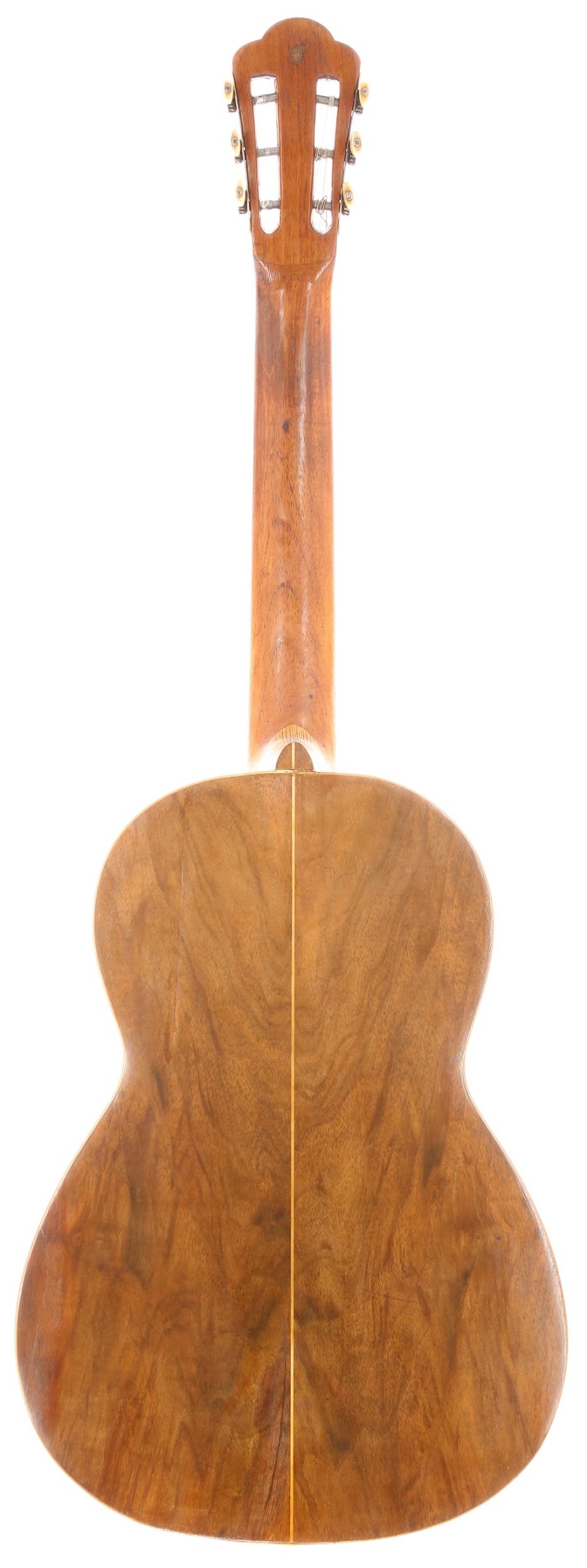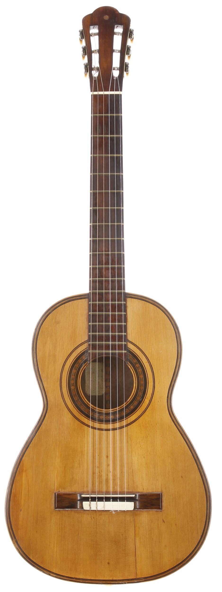 Early 20th century guitar by and labelled Saturnino Rojas, Calle De Atocha, 115, Madrid; Back and sides: walnut, repaired stable hairline to upper bout treble side and lower bout treble side; Top: natural spruce, one repaired hairline, other minor play wear, evidence of bridge resetting/restoration; Neck: cedar, slight bow; Fretboard: rosewood, light groove wear to first position; Frets: good, brass, refret; Hardware: good; Scale length: 640mm; Nut width: 50mm; Overall condition: good